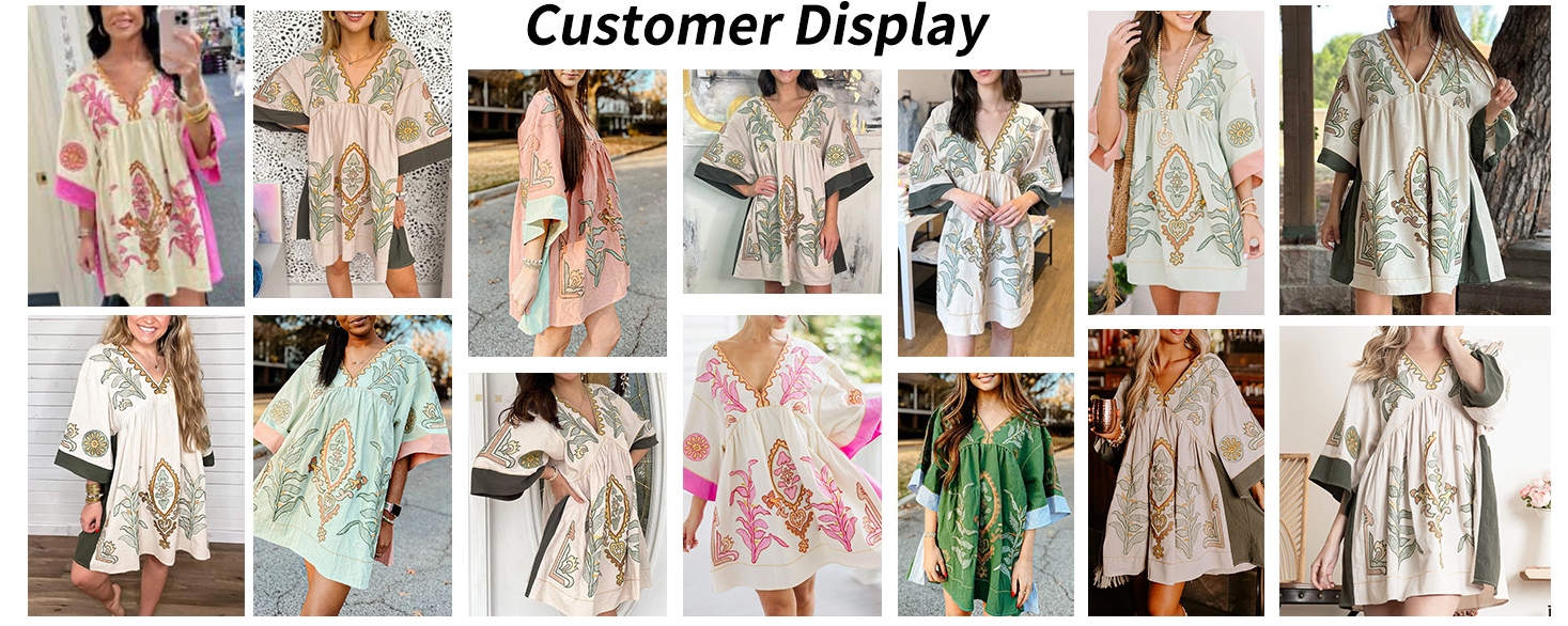Elevate your wardrobe with our elegant Women's V-Neck 3/4 Sleeves Loose Fit Vintage Embroidered Dress. This chic piece exudes effortless style with its flattering silhouette and intricate embroidery details. Perfect for any occasion.