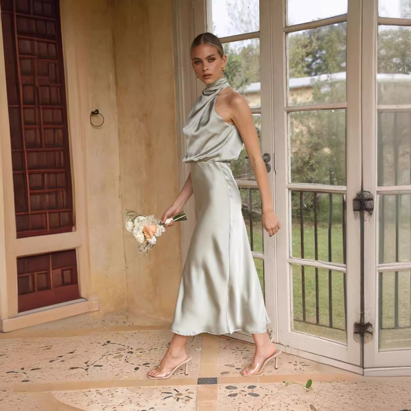 Light and mature temperament women's sleeveless neck-hanging multi-color printed evening dress dress