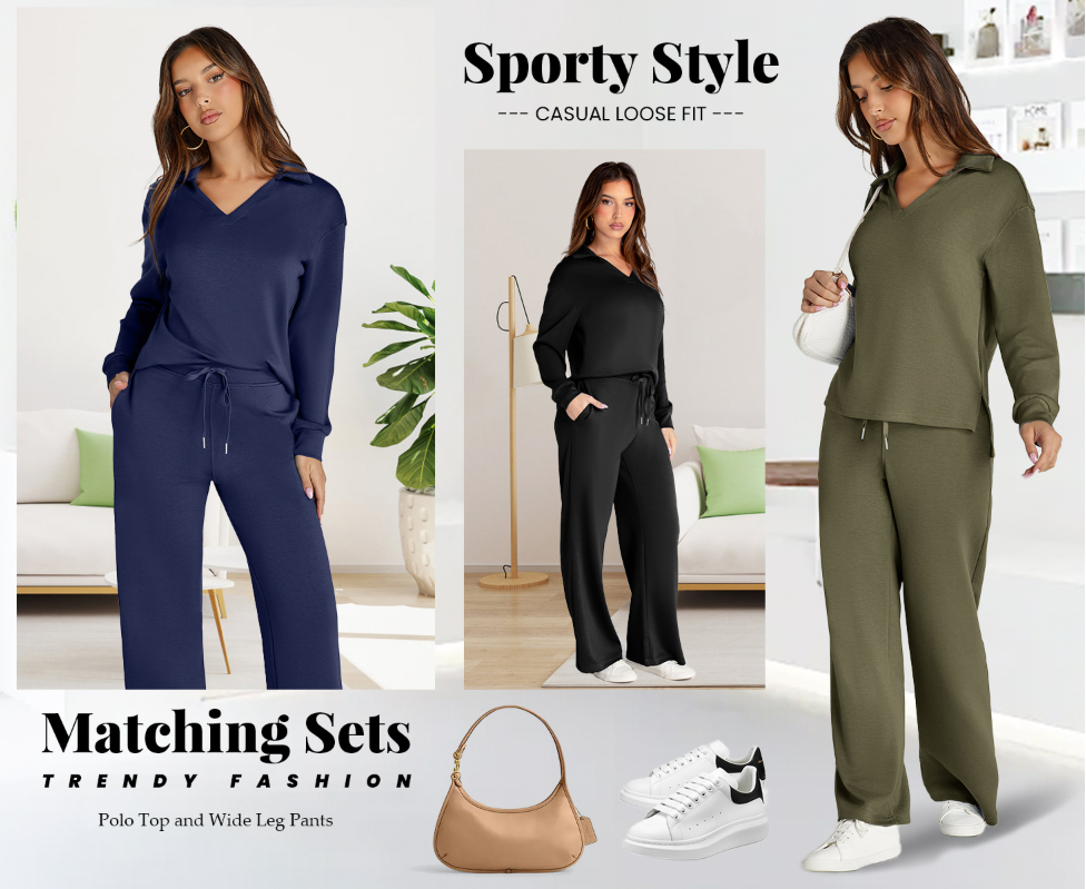 2025 Spring Women's Polo Shirt Long Sleeve and Wide Leg Pants Set (Buy 2 Free Shipping)