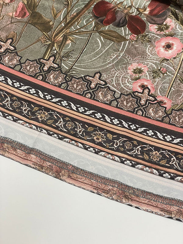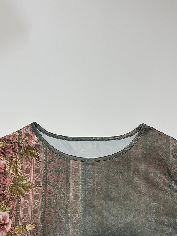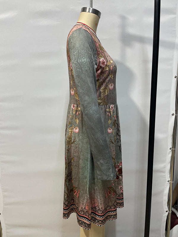 A-line Long Sleeves Flower Print Pleated Split-Joint Round-neck Mini Dresses