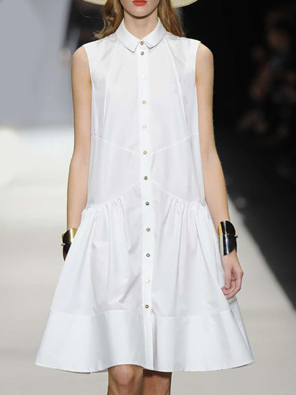 A-line Loose Buttoned Pleated Solid Color Lapel Mini Dresses