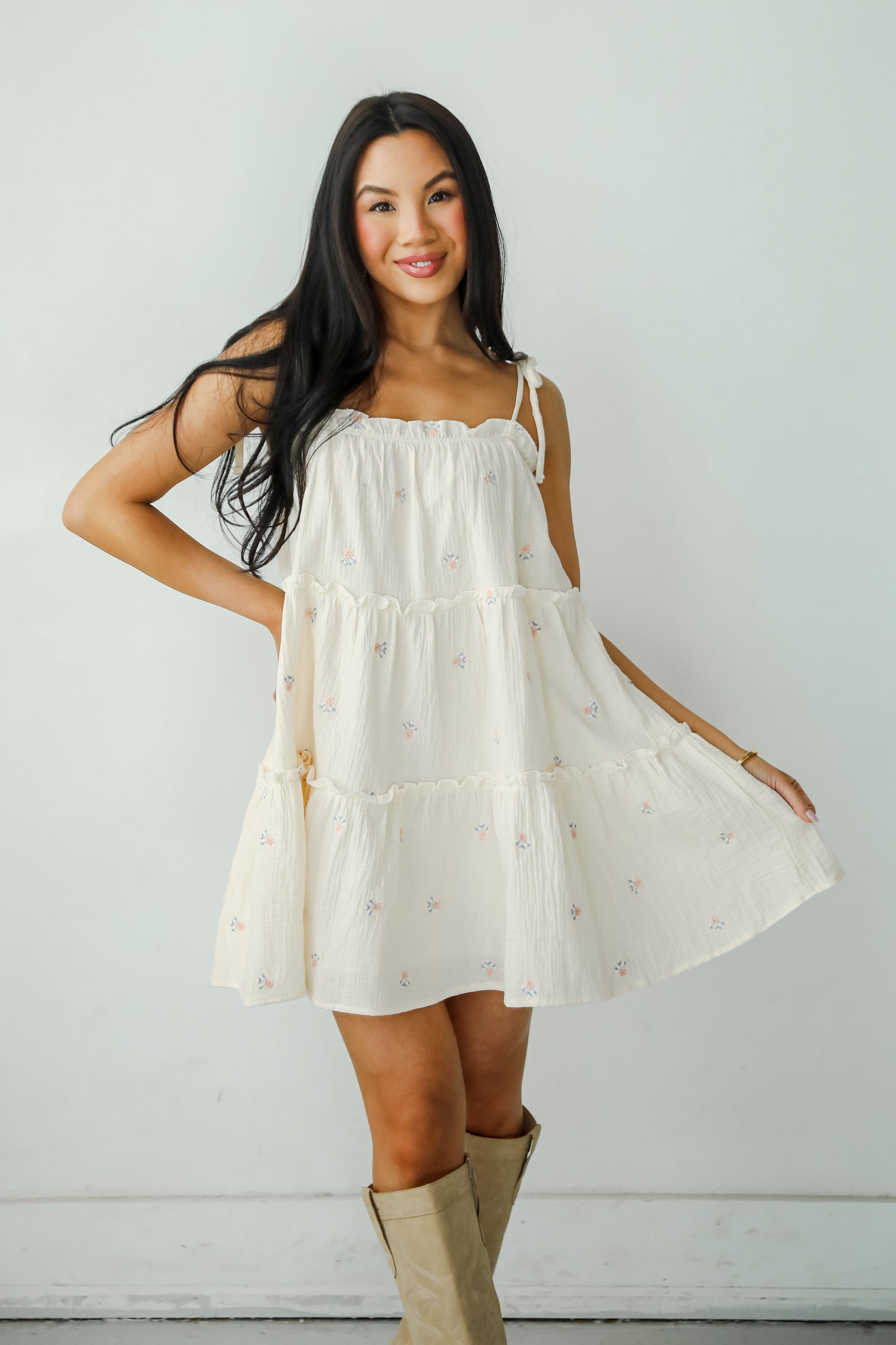 Watch yourself (and everyone else) fall for every detail of the Adored Outing Cream Floral Linen Tiered Mini Dress! Crafted from airy. breathable linen. it features delicate embroidered flowers that add a touch of whimsy and feminine detail. The tiered silhouette creates a playful. flowy shape. perfect for warm. sunny days. Adjustable tie straps offer a customizable fit with a sweet. dainty finish. Whether you're heading to a picnic. brunch. or a weekend getaway. this dress pairs beautifully with sandals or espadrilles for a light. breezy look that's both romantic and carefree!