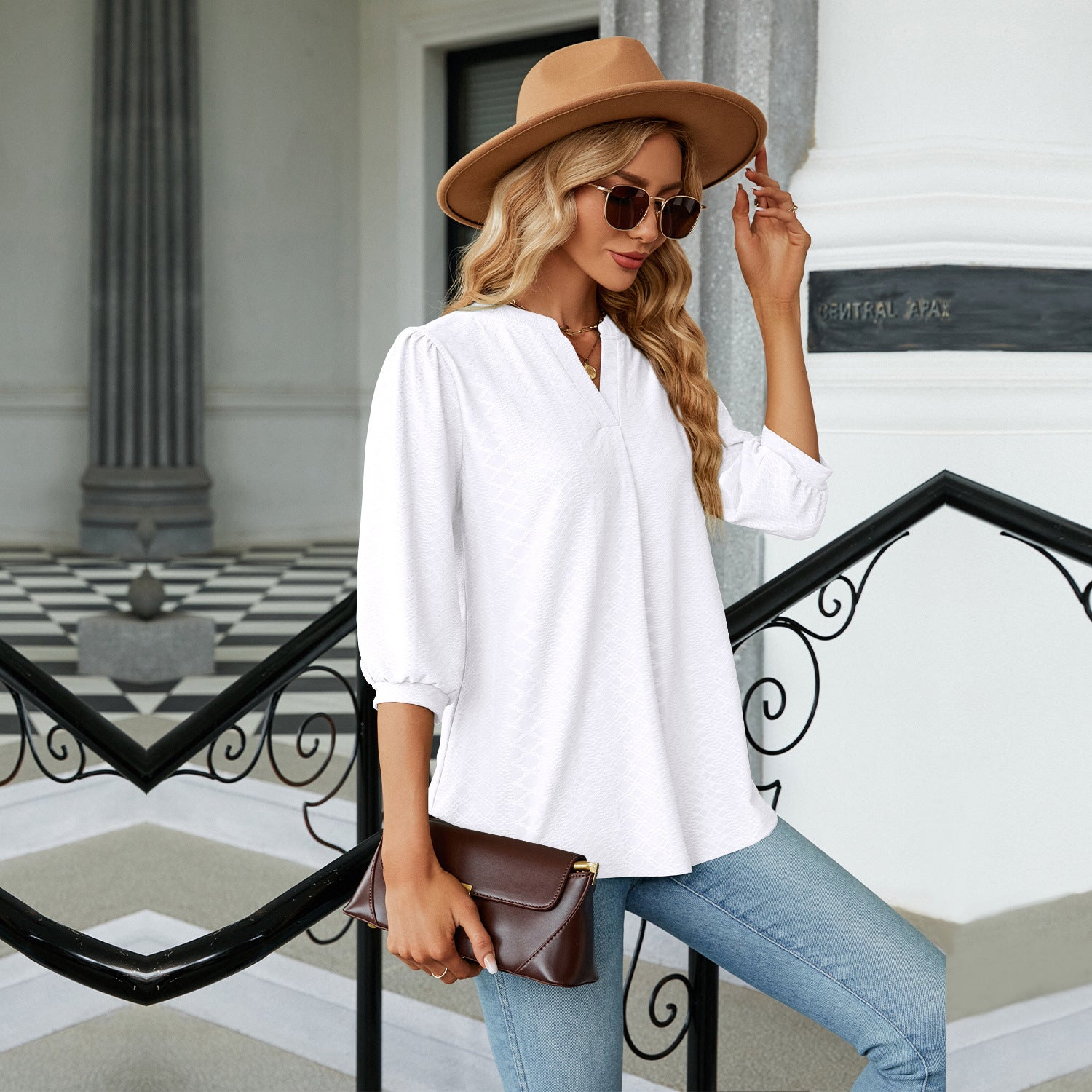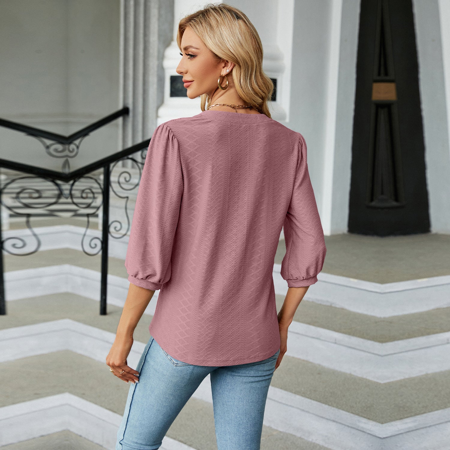 Autumn and Winter new solid color and V-neck jacquard 3/4 sleeve loose-fitting T-shirt top women