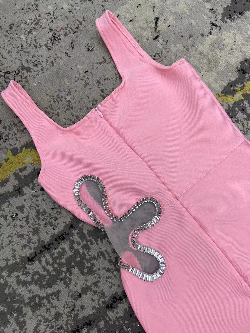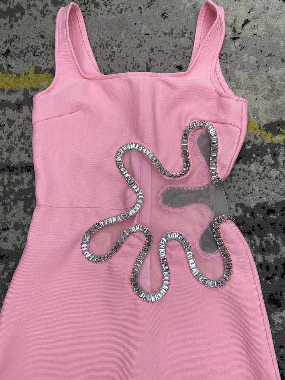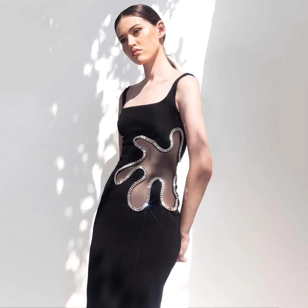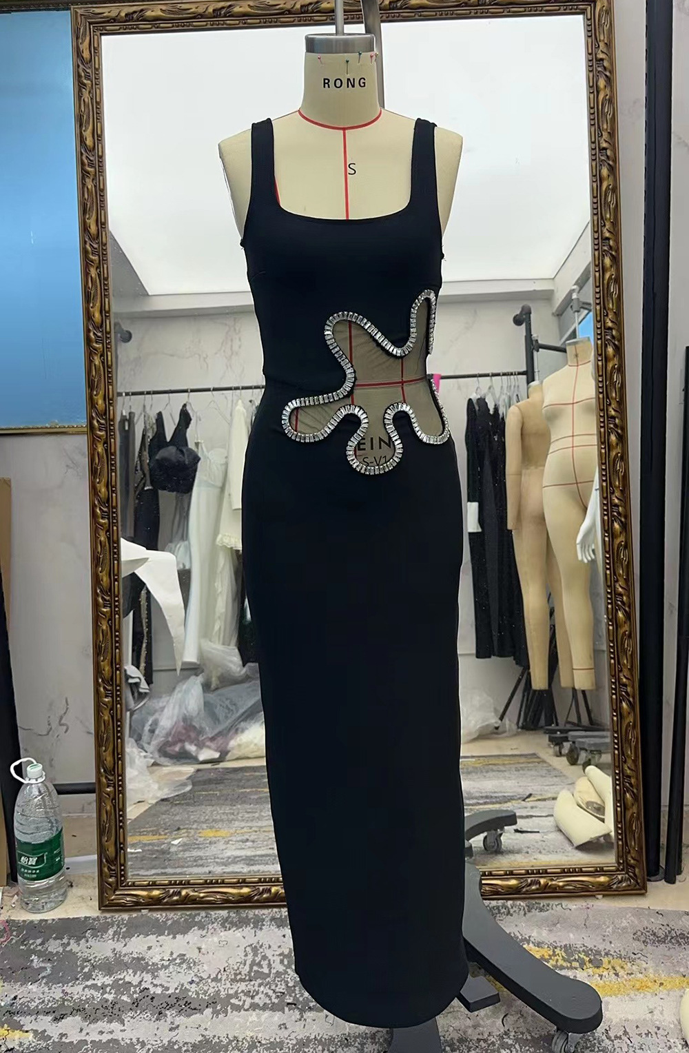 Black Sexy Sleeveless Square Collar Mesh See-Through Diamond Bandage Dress