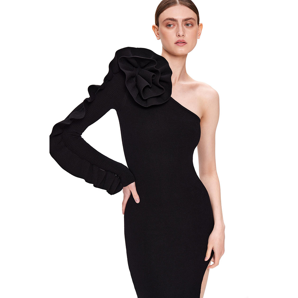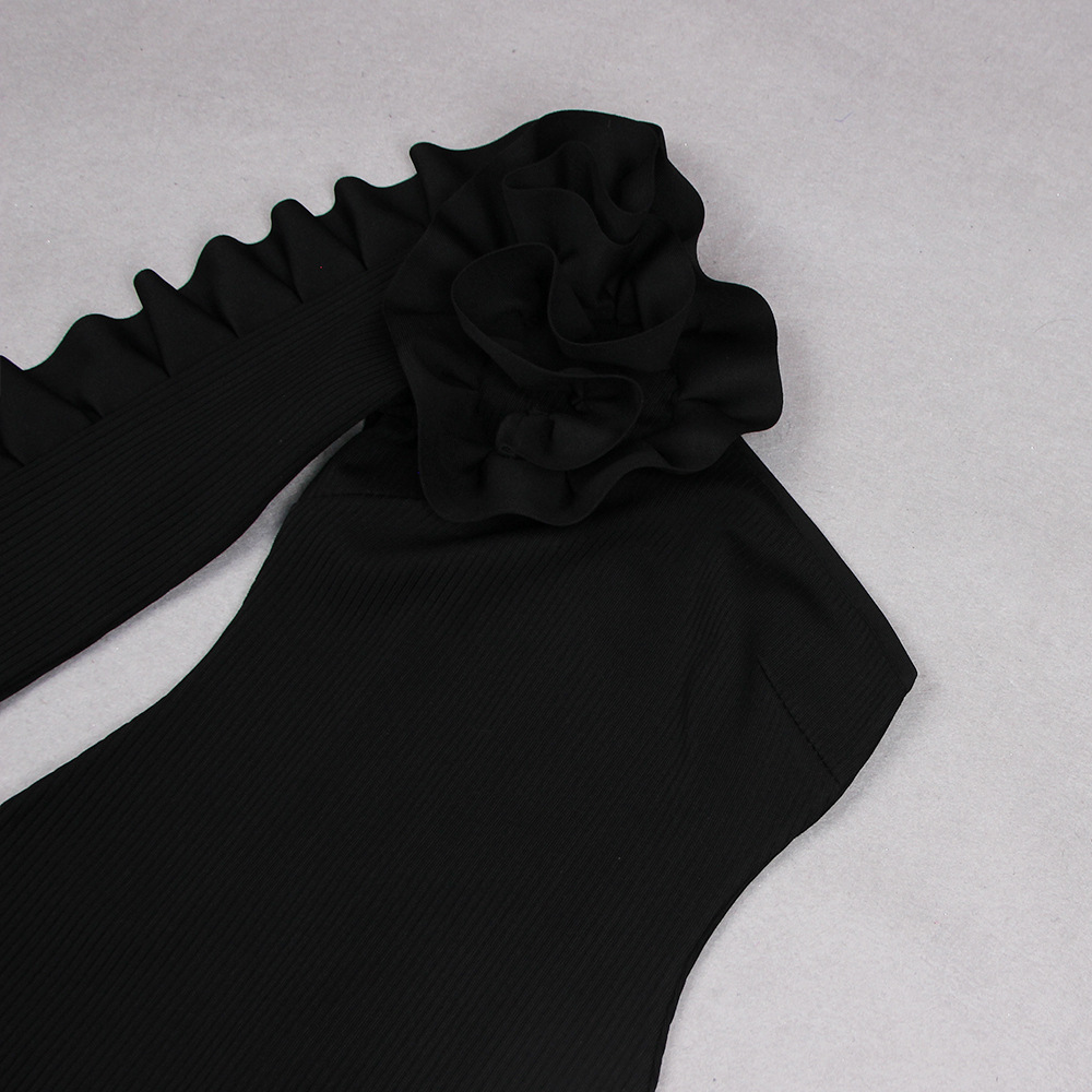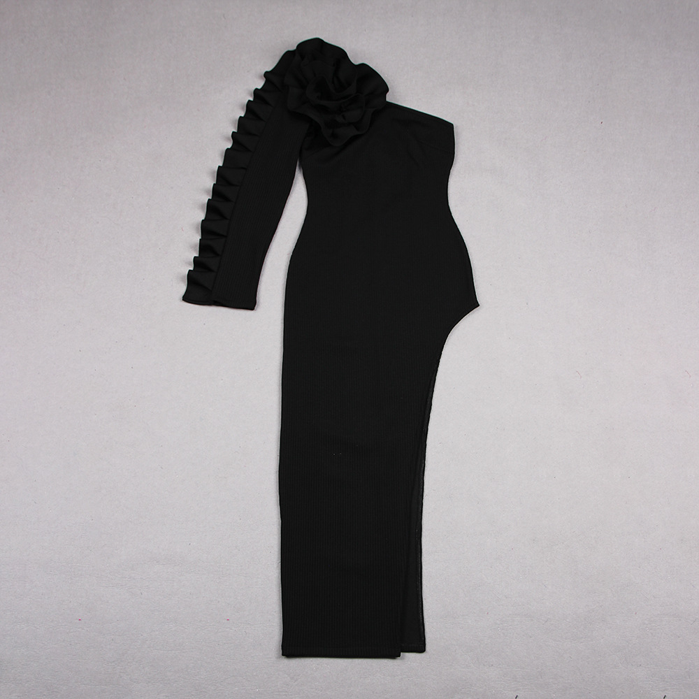 Black Single Sleeve Oblique Shoulder Flower Tight Split Bandage Dress