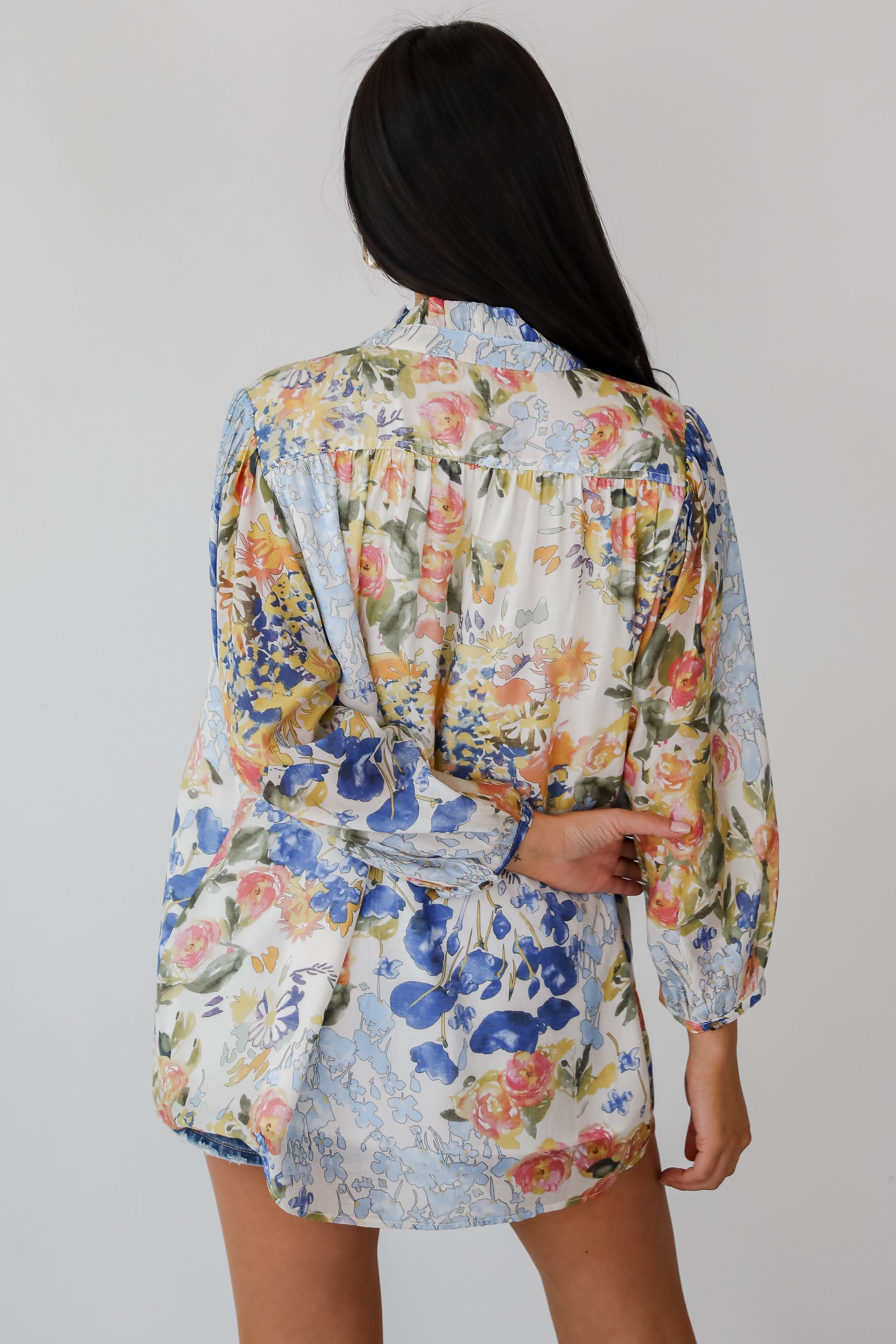 Romance will blossom wherever you go with the Blooming For Love Floral Blouse! The bold. multicolored floral print brings a fresh. lively energy. making it the perfect statement piece for spring and summer. Crafted from a soft. lightweight fabric. this blouse offers a comfortable. relaxed fit with a flattering neckline and subtle sleeve details. Whether tucked into high-waisted jeans for a casual look or paired with a skirt for a more polished ensemble. this blouse brings effortless charm and versatility to any occasion. Embrace the beauty of the season with this eye-catching floral top! Available in 2 colors.