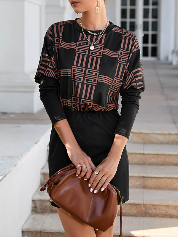 Bodycon Long Sleeves Contrast Color Elasticity Printed Round-Neck Mini Dresses