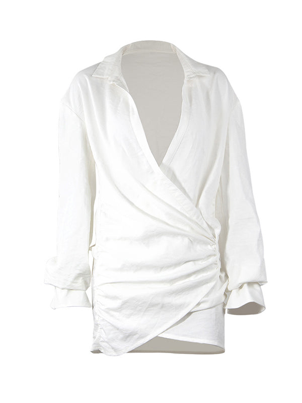 Bodycon Long Sleeves Pleated Solid Color Deep V-Neck Mini Dresses Shirt Dress