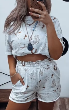 Made from washed French terry. they feature a loose fit. a fun graphic print. and lots of detail. The top is a wide crew neck French terry top with a graphic print and frayed hem. The pants are French terry wide leg elastic waistband pants with a graphic print and side pockets. and washed French terry graphic shorts with pockets and frayed hem detail.