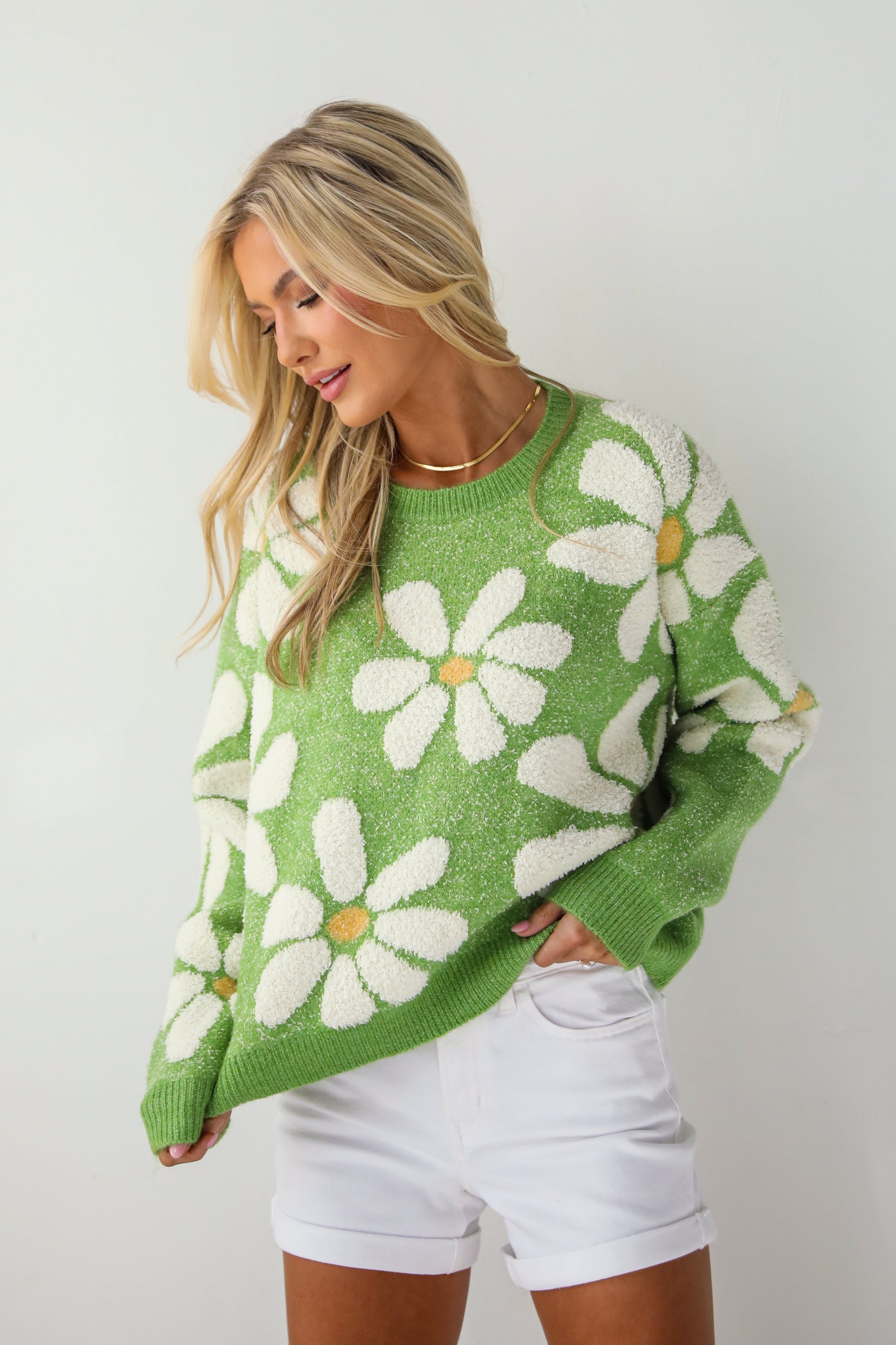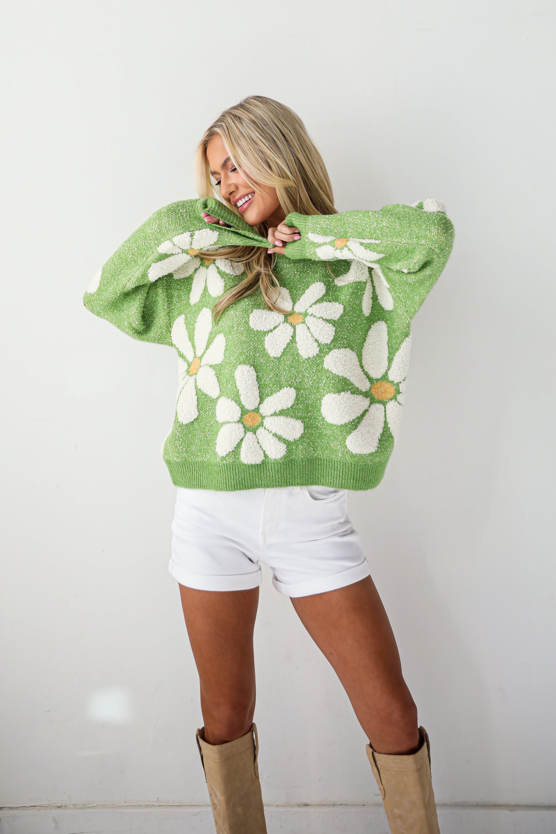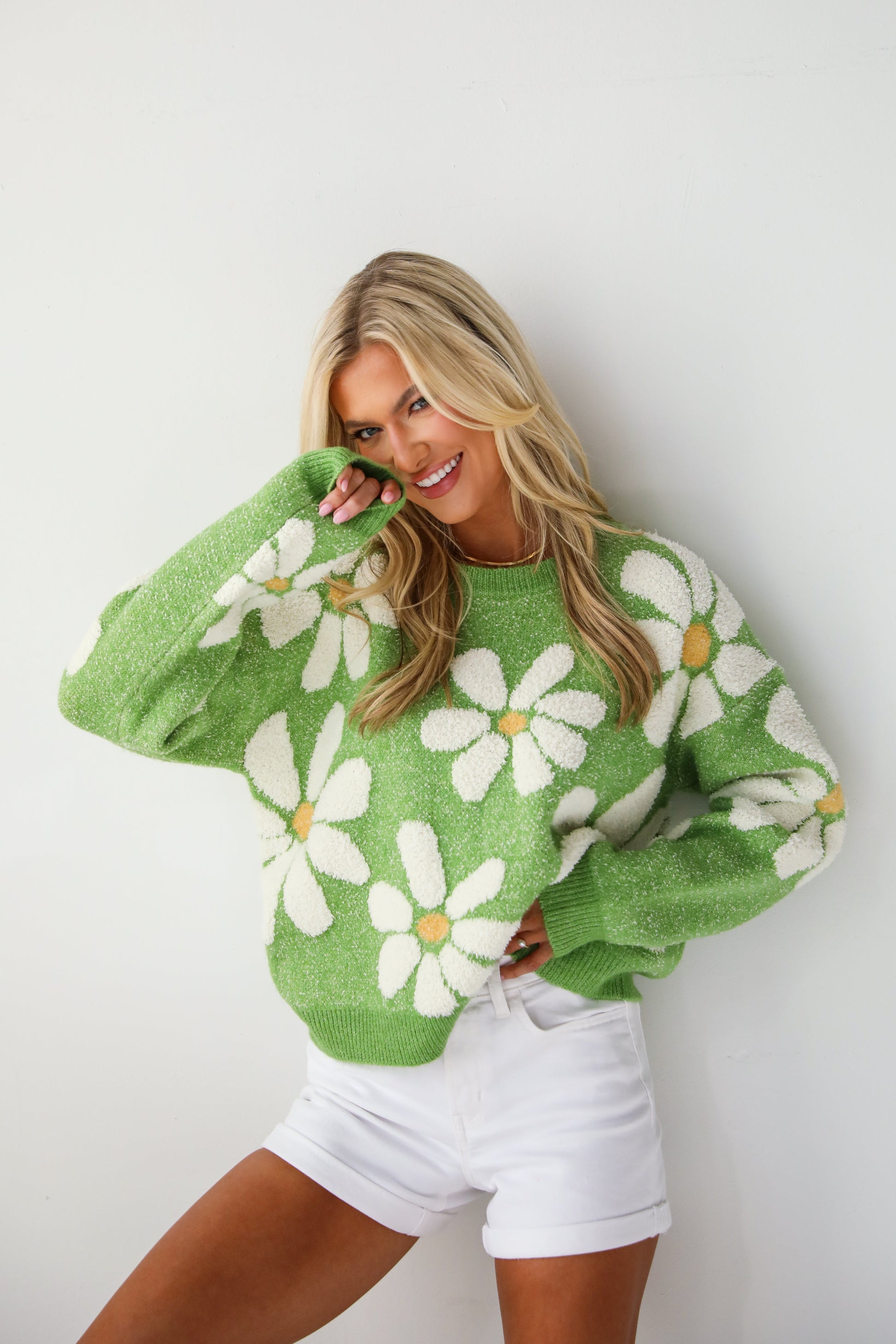 Everyone will applaud your stunning style when they see you in the Brilliant Arrival Green Daisy Sweater! Made from a soft. fuzzy knit fabric. this sweater combines cozy warmth with a whimsical touch. The vibrant green hue serves as the perfect backdrop for the bright. cheerful daisy print that adds a fun and feminine flair. With a relaxed fit and gentle stretch. it ensures all-day comfort while making a bold style statement. Perfect for pairing with jeans or skirts. this sweater is a fresh. eye-catching addition to your casual wardrobe!
