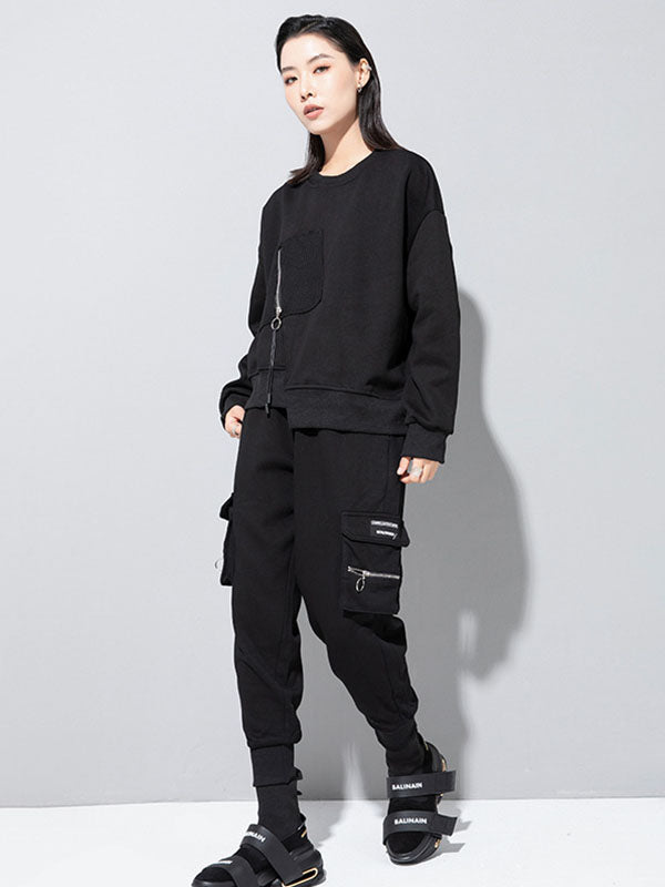 Casual Loose Long Sleeves Asymmetric Solid Color Zipper Round-Neck Sweatshirt Tops