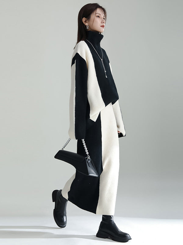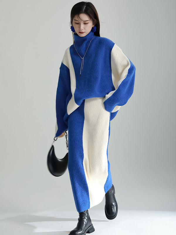 Casual Loose Long Sleeves Contrast Color High-Neck Sweater Top&Skirt Two Pieces Set