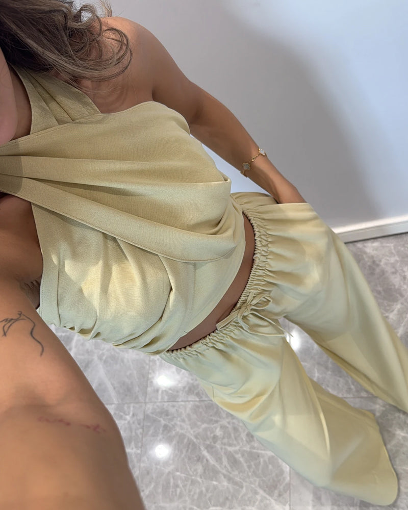 Casual Solid Color Lace-Up Top & Pants Two-Piece Set