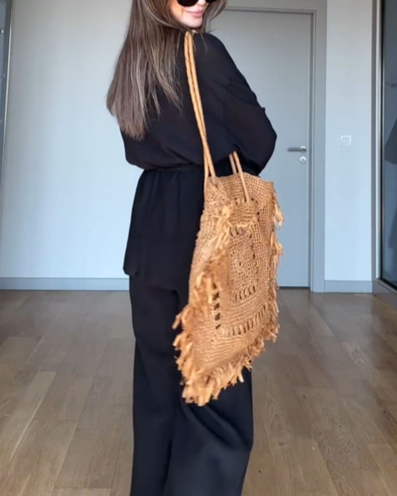 Casual Solid Color Lappel Top & Pants Two-Piece Set