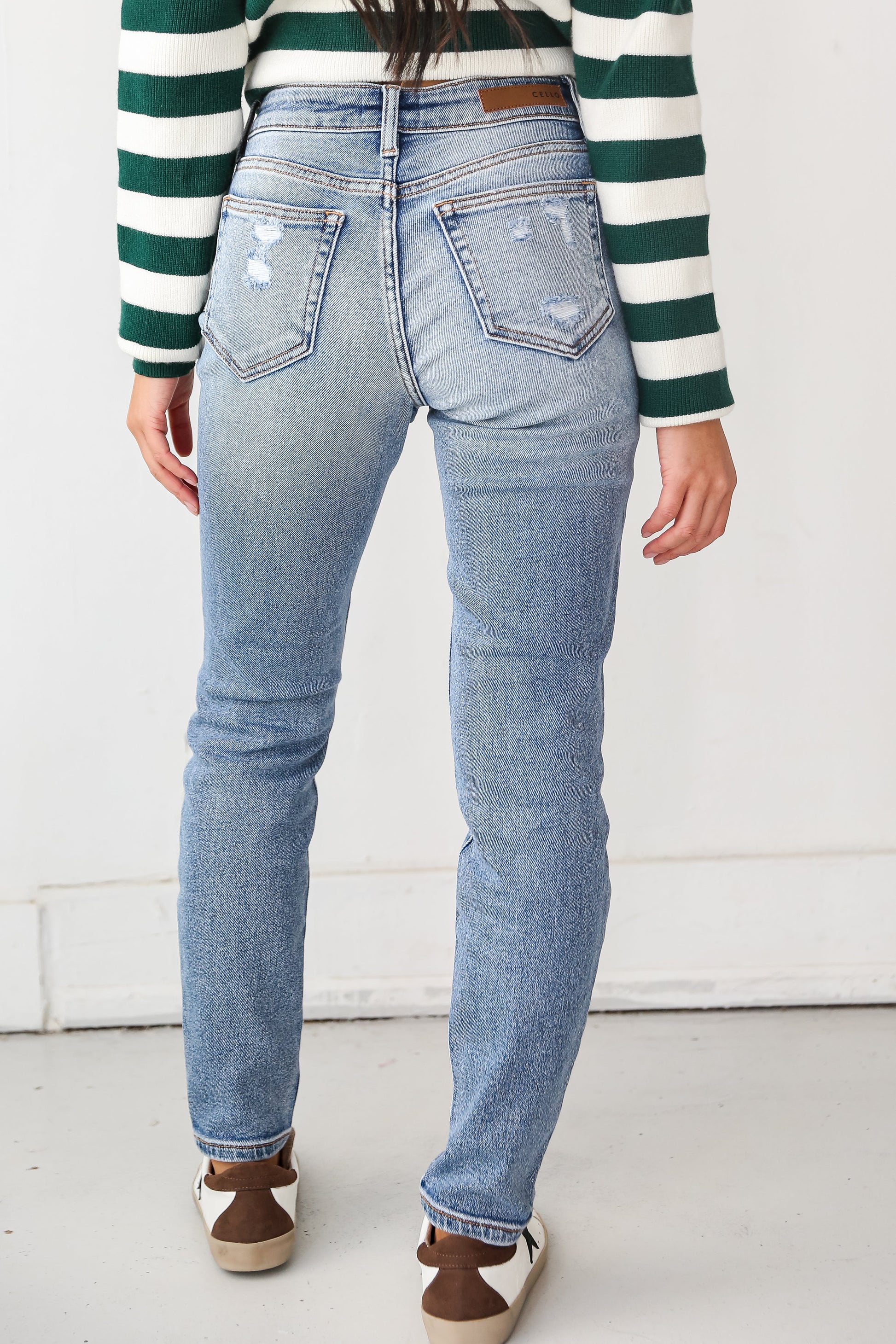 Get a classically cool look in no time with the Certified Coolest Light Wash Distressed Slim Jeans! These jeans effortlessly combine classic style with contemporary flair. providing a versatile piece that seamlessly transitions from casual to chic. The medium wash of these jeans adds a touch of character. creating a lived-in look that exudes both comfort and sophistication. The high-waisted design not only offers a flattering fit but also adds a hint of vintage charm. emphasizing your waist and elongating your silhouette for a polished appearance. Designed for both style and comfort. the straight leg cut provides a sleek and tailored look that complements a variety of outfits. Whether paired with a casual tee for a relaxed daytime ensemble or dressed up with a blouse for a more refined look. these jeans are a versatile addition to your collection!