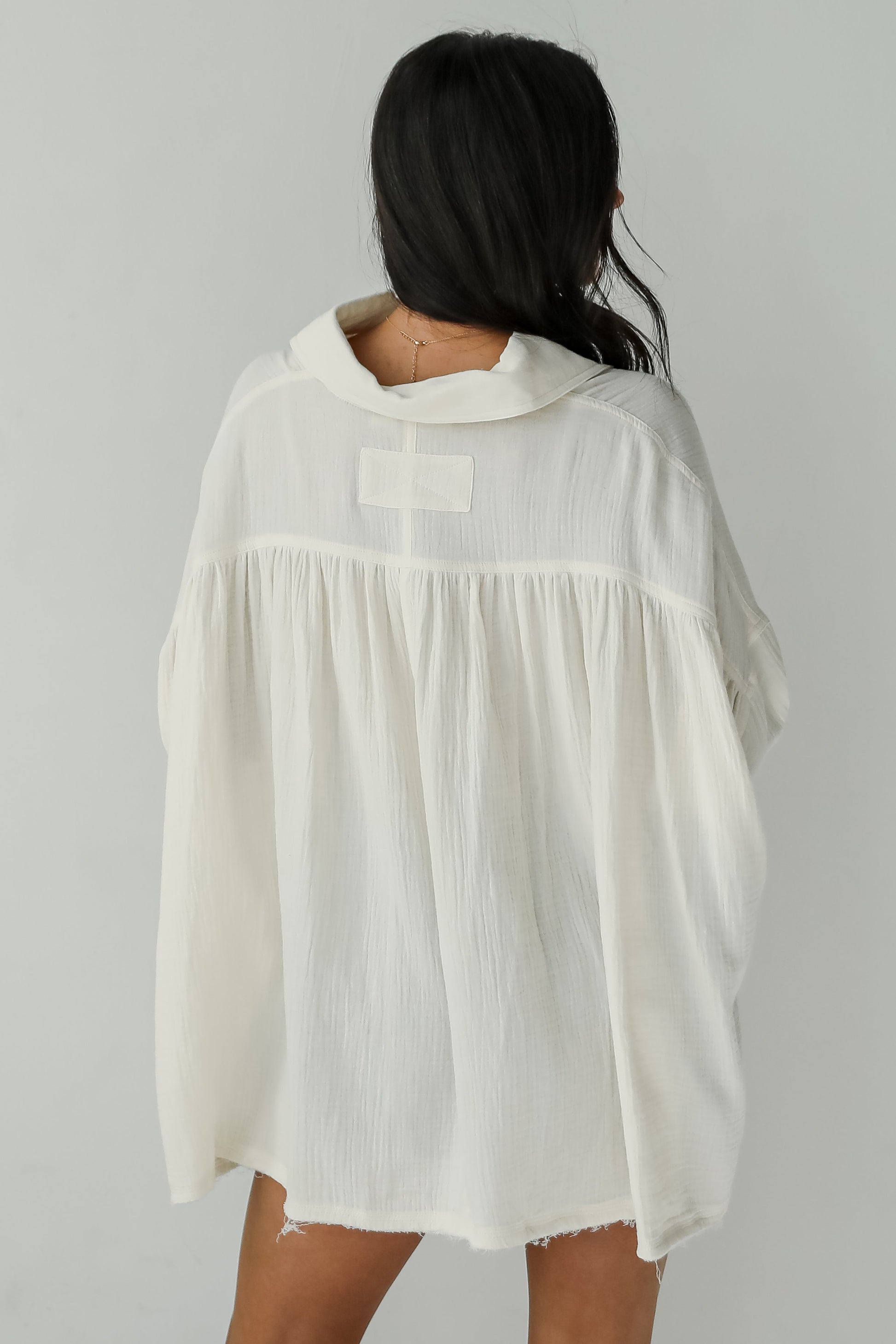 Set a stylish example whenever you go out wearing the Charming Influence Cream Linen Button-Up Blouse! Made from breathable. lightweight linen. this blouse features a relaxed oversized fit for a comfortable yet effortlessly chic look. The button-up front and classic collar add a touch of sophistication. while the creamy neutral hue makes it a versatile piece for any season. Style it tucked into high-waisted trousers for a polished vibe or wear it open over a tank and shorts for a breezy. casual ensemble!