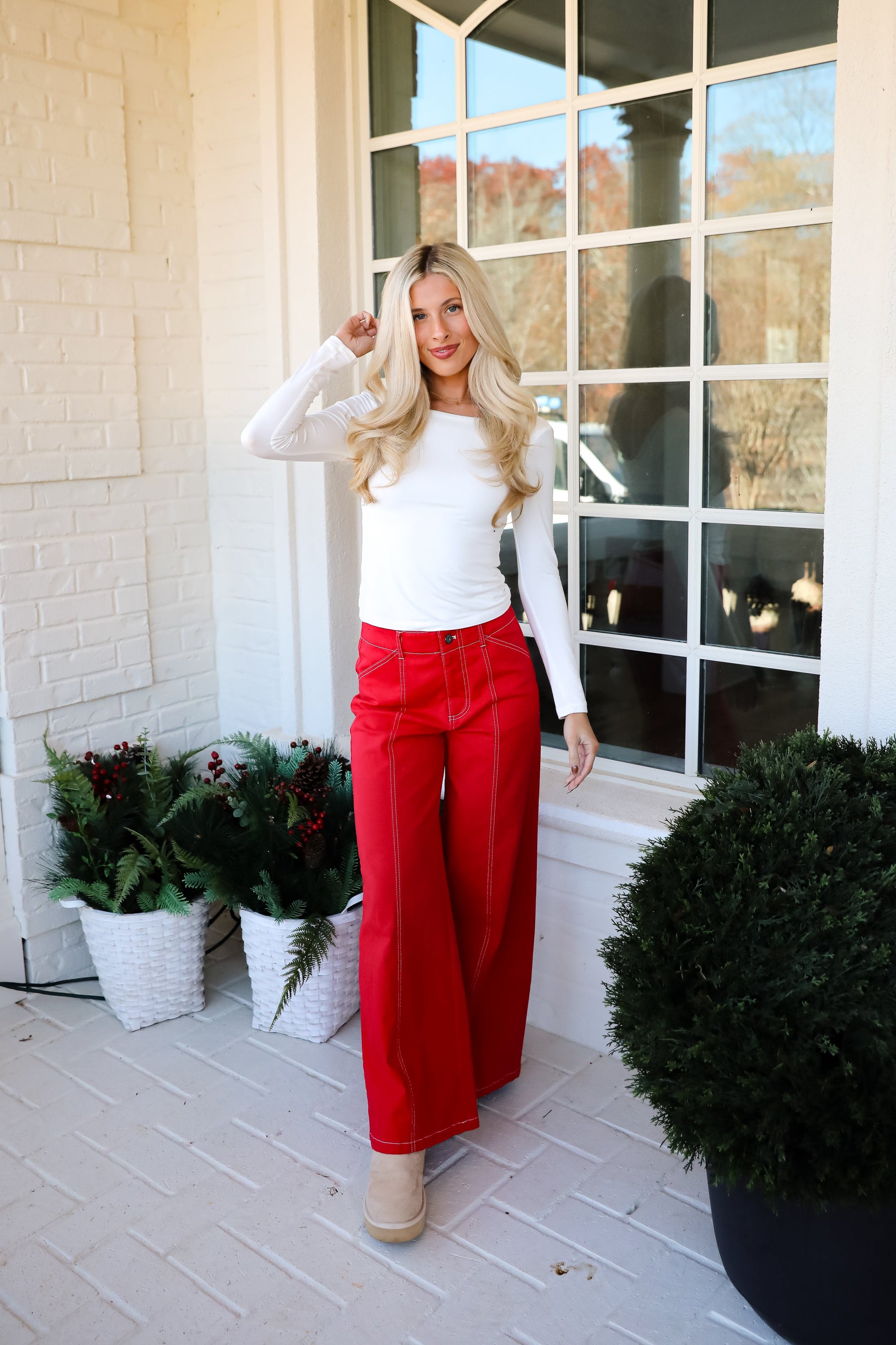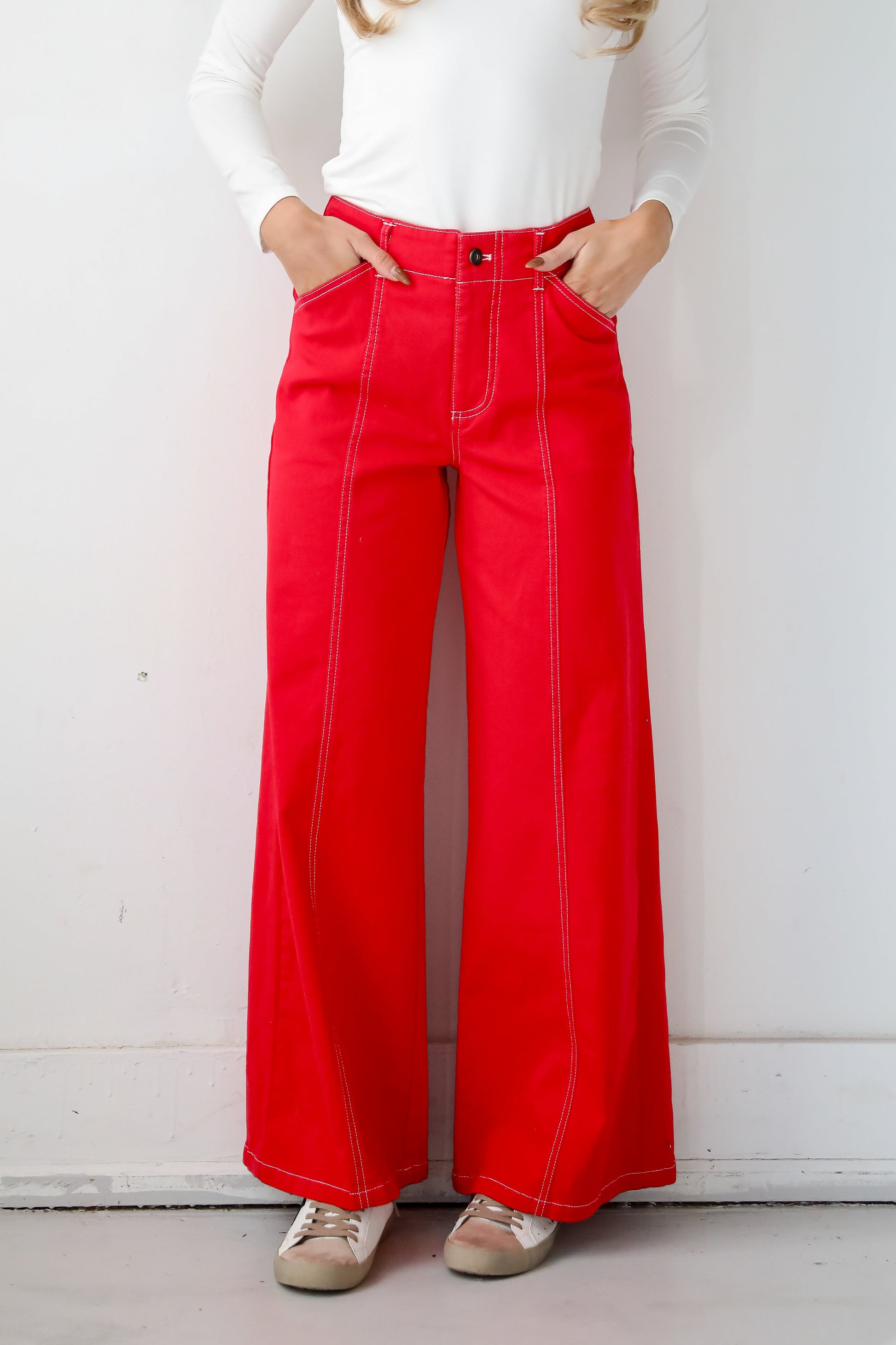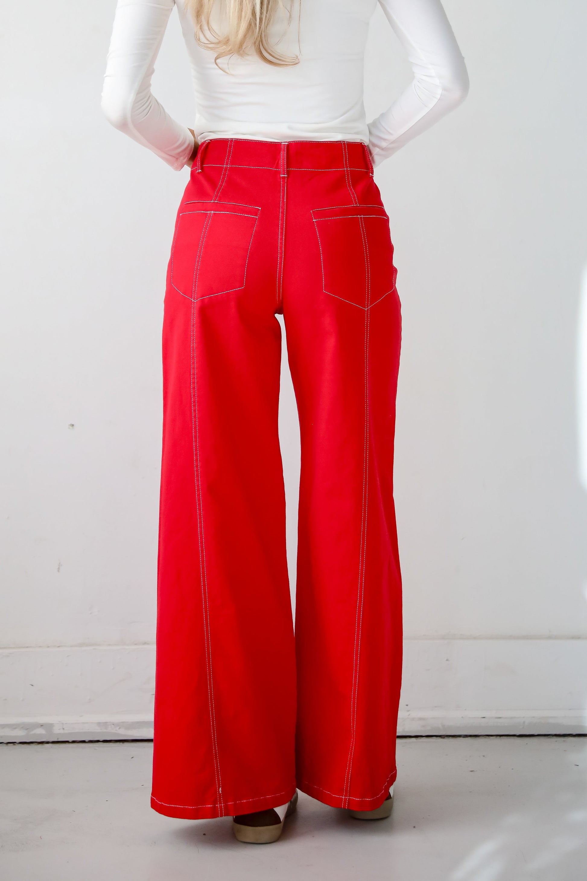 Step out feeling like the confident babe you are in the Chic Consideration Red Wide Leg Pants! The striking red hue adds a pop of personality. while the high-waisted design elongates the legs and accentuates your curves. Featuring wide-leg styling. these pants offer a relaxed. comfortable fit with plenty of room to move. The white stitching adds a touch of contrast and a clean. polished finish. Pair with a tucked-in blouse for a chic look or a casual tee for effortless everyday style. These pants are a must-have for anyone looking to make a fashion-forward statement!