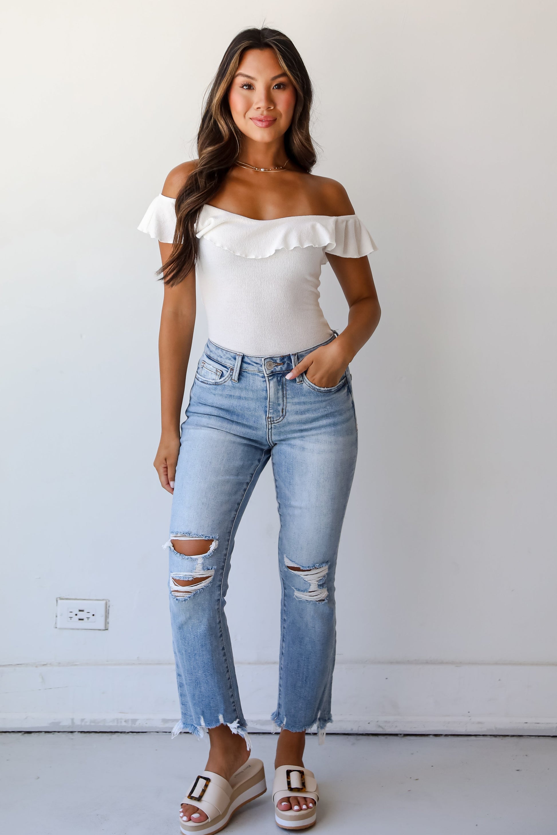Introducing the Cindy Light Wash Distressed Crop Flare Jeans – a perfect fusion of casual comfort and on-trend style! Elevate your denim collection with these fashion-forward jeans that seamlessly blend a light wash. high-rise silhouette. distressed detailing. and a playful crop flare. The light wash of these jeans exudes a laid-back and vintage-inspired vibe. making them a versatile choice for various occasions. The high-waisted design not only adds a touch of retro charm but also provides a flattering fit. accentuating the waist and elongating the legs for a chic silhouette. Pair them with sneakers for a casual day out or dress them up with heels for a more polished look!