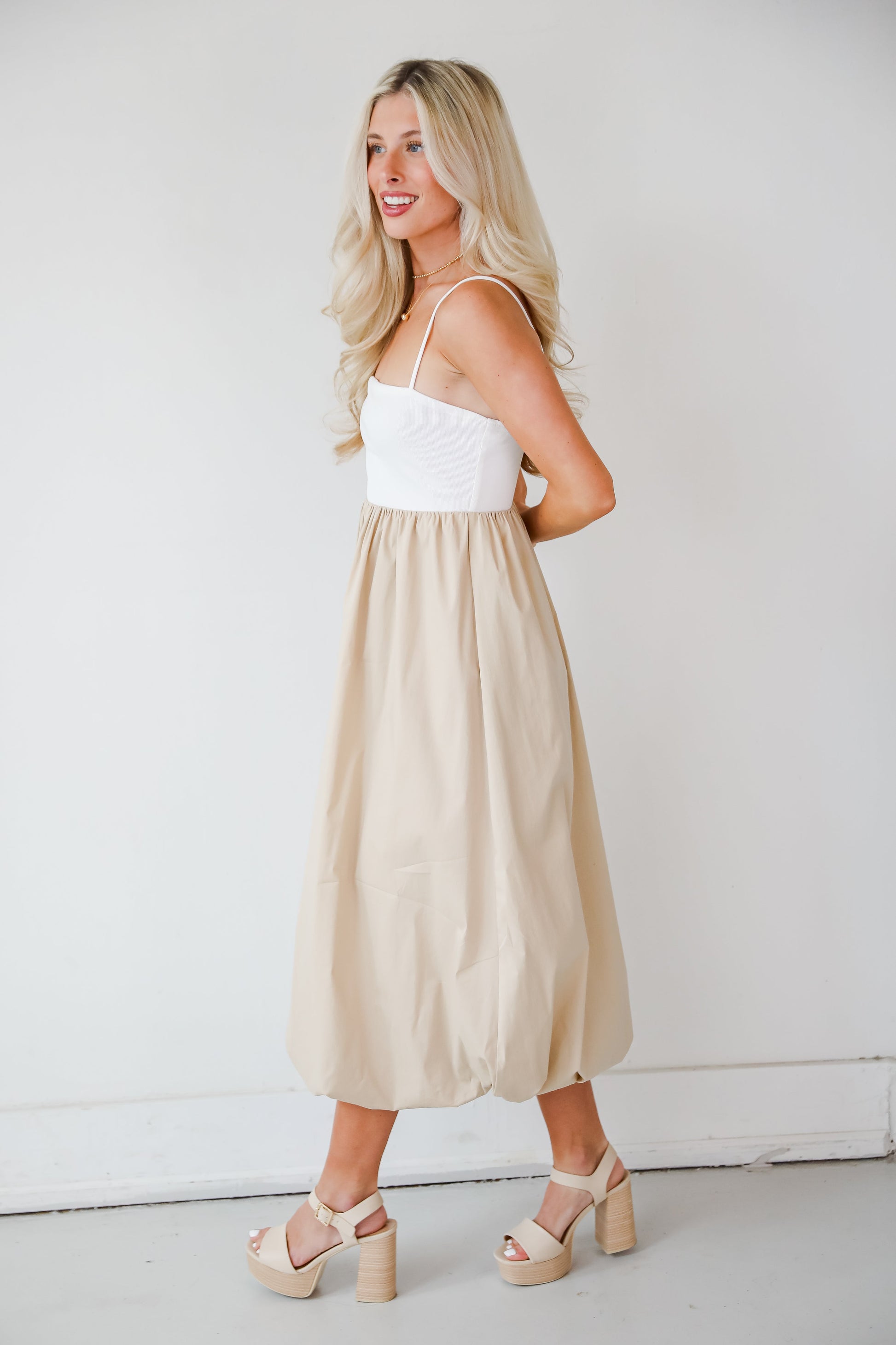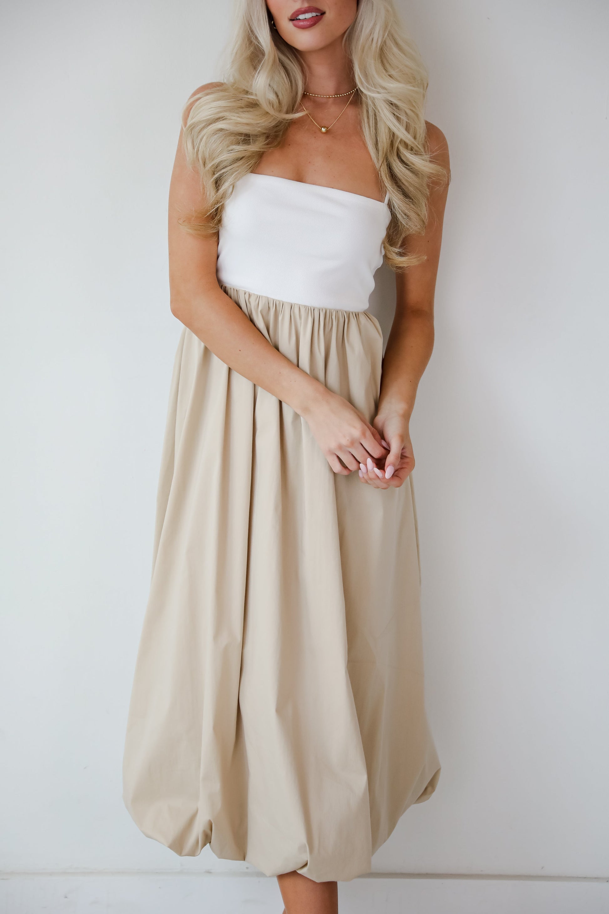 From street chic looks to upscale 'fits. the Confidently Unique Taupe Contrast Midi Dress is ready to become your OOTD must-have! Featuring a fitted white ribbed knit upper with adjustable spaghetti straps. this dress offers a flattering. comfortable fit that moves with you. The soft. breathable fabric provides the perfect balance of cozy and chic. The taupe bubble hem skirt adds a playful. feminine touch. creating a striking contrast that enhances the silhouette. Ideal for everything from brunches to evening outings. this versatile midi dress can easily be dressed up with heels or paired with sandals for a more laid-back vibe. A must-have for modern. sophisticated style!