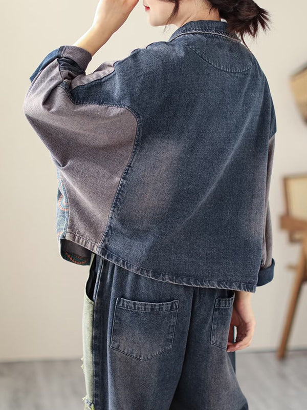 Contrast Color Fringed Split-Joint Long Sleeves Printed Outwear + Harem Pants Two Pieces Set