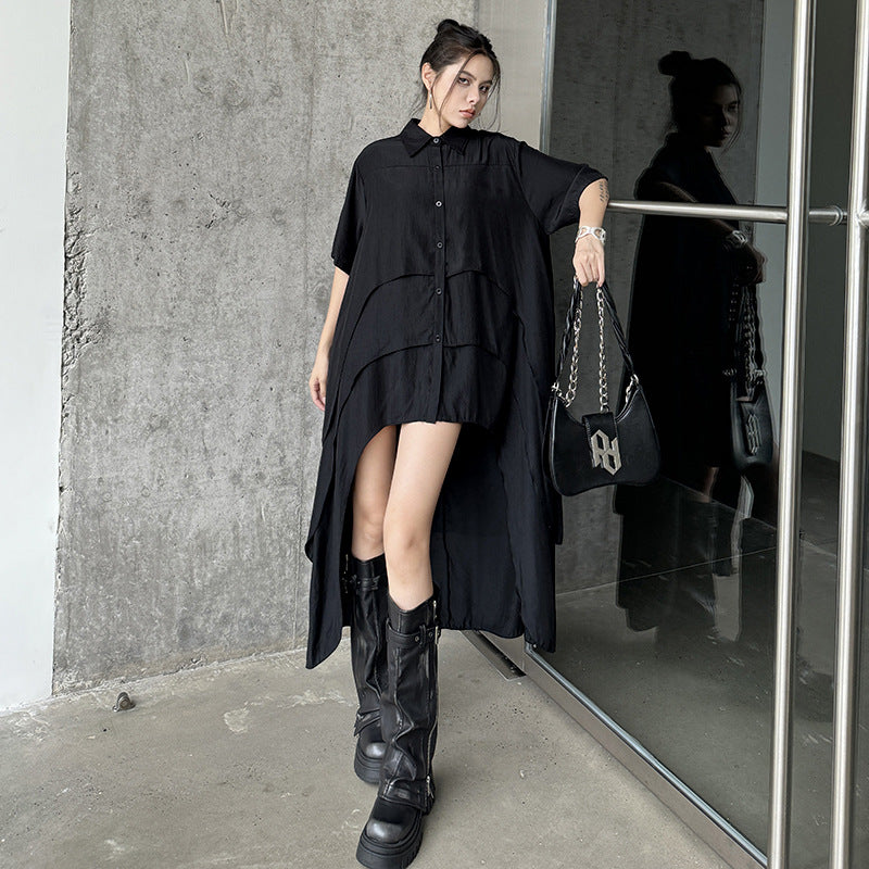 Cool Black Irregular Hem Short Sleeve Shirt Dress