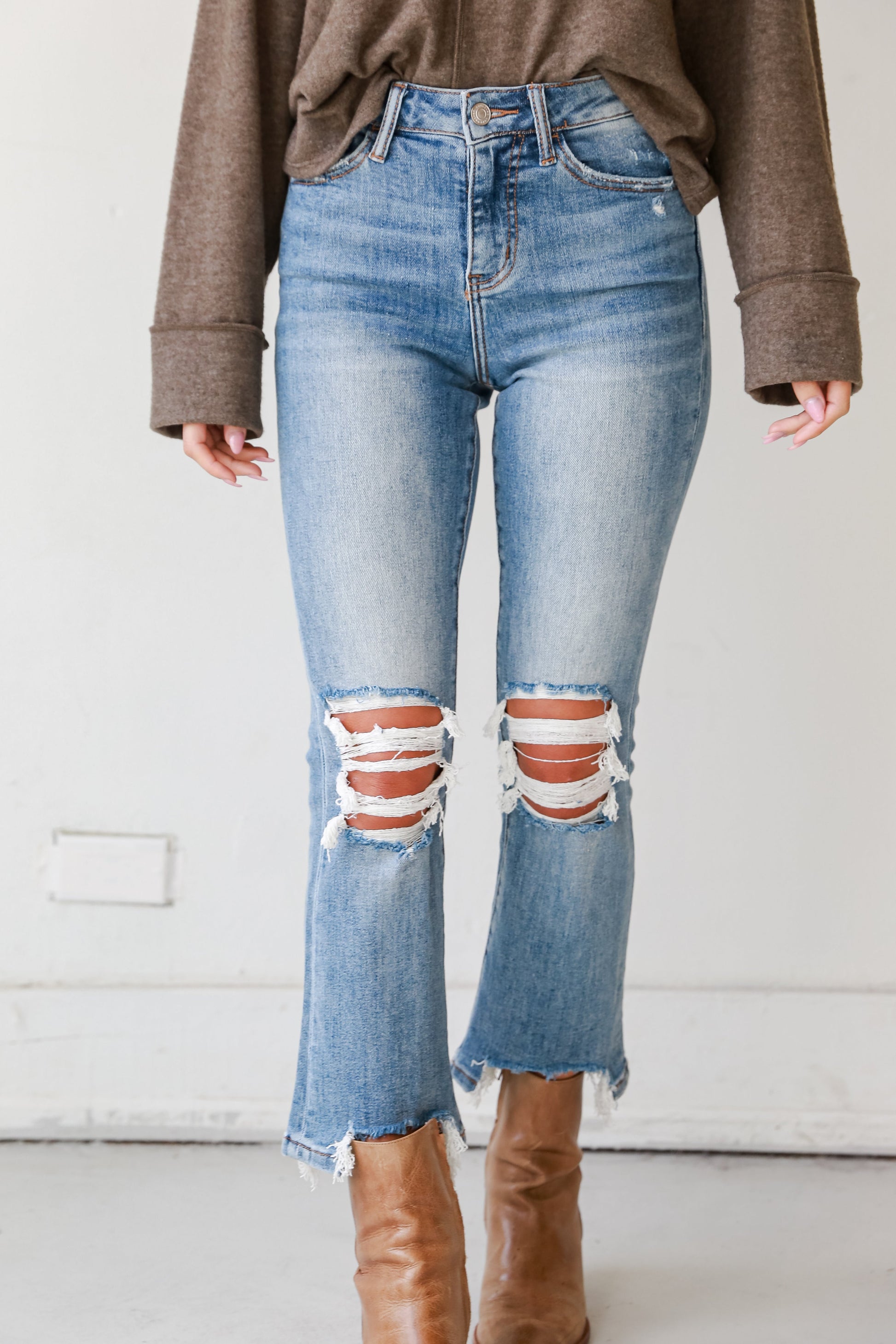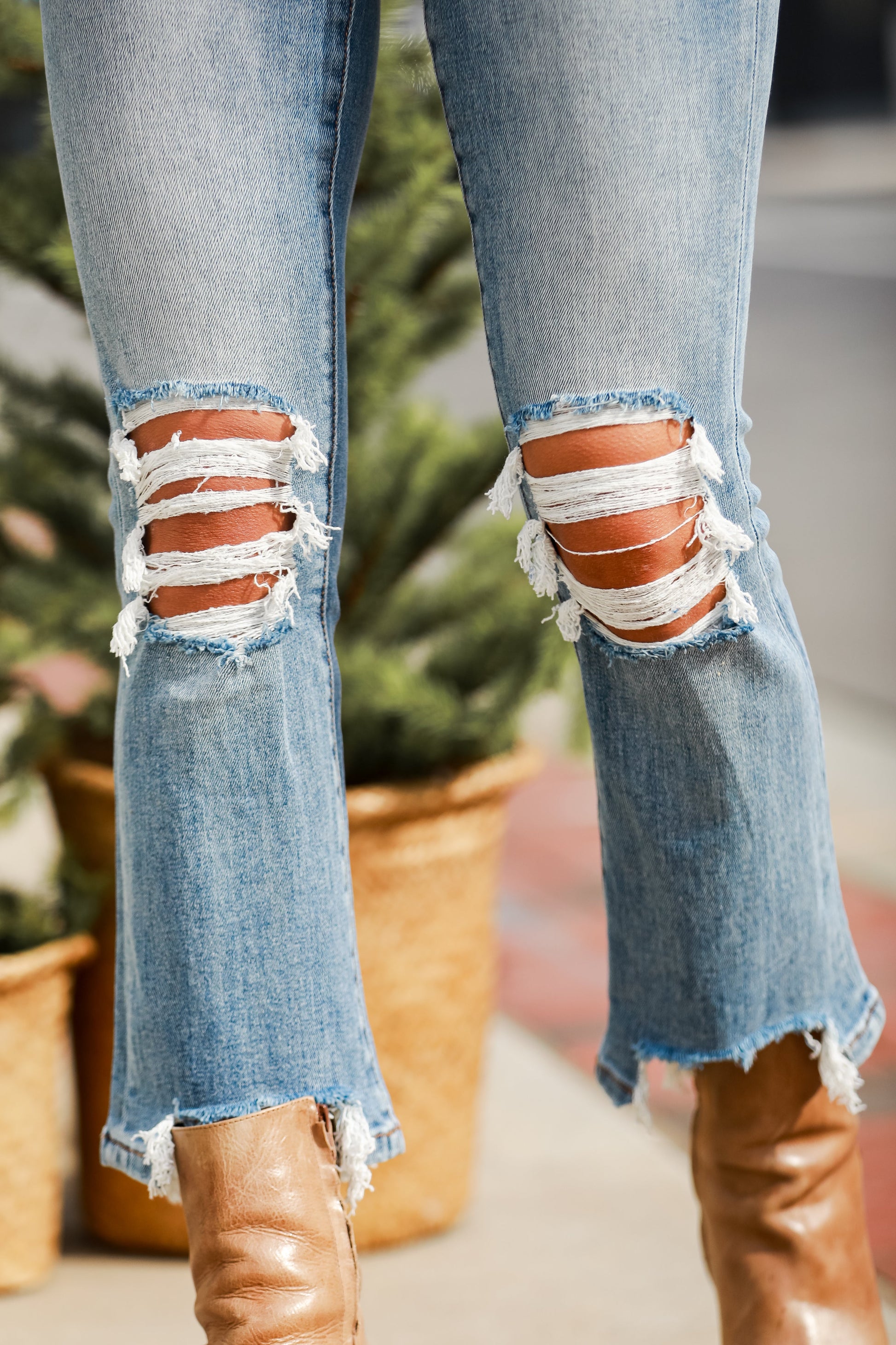 Introducing the Courtney Light Wash Distressed Kick Flare Jeans Plus—a modern and on-trend addition to your denim collection that effortlessly fuses style with comfort! Crafted with meticulous attention to detail. these jeans feature a light wash. a flattering high-rise fit. and trendy distressed details for an edgy. fashion-forward look. The distressed detailing on these kick flare jeans adds a rebellious and chic element. Strategically placed rips and frayed edges contribute to the worn-in aesthetic. creating an effortlessly cool vibe that's perfect for expressing your individual style. The versatility of these jeans allows you to create a range of stylish outfits for various occasions!