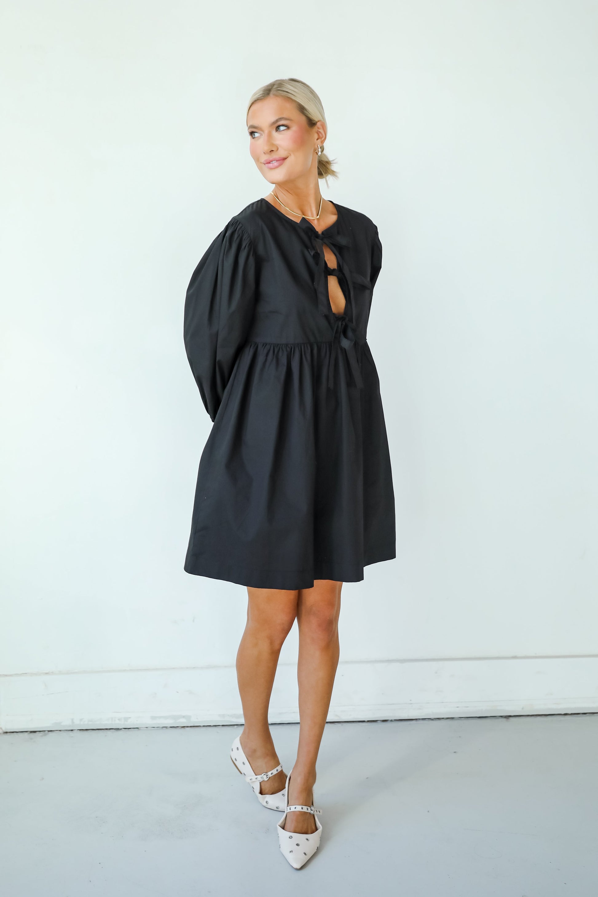 For maximum attention. we suggest styling your charming self in the Cute Definition Black Bow Babydoll Mini Dress! Featuring a flattering babydoll silhouette. it gently cinches under the bust for a flowy. relaxed fit that's both comfortable and chic. The playful bows on the front add a sweet. flirty touch. elevating the simple black design with a fun. girly detail. Perfect for any occasion. this mini dress can be dressed up with heels or kept casual with sandals. Whether you're heading out for brunch or a night out. this dress is a versatile. stylish piece that brings effortless elegance to your wardrobe!