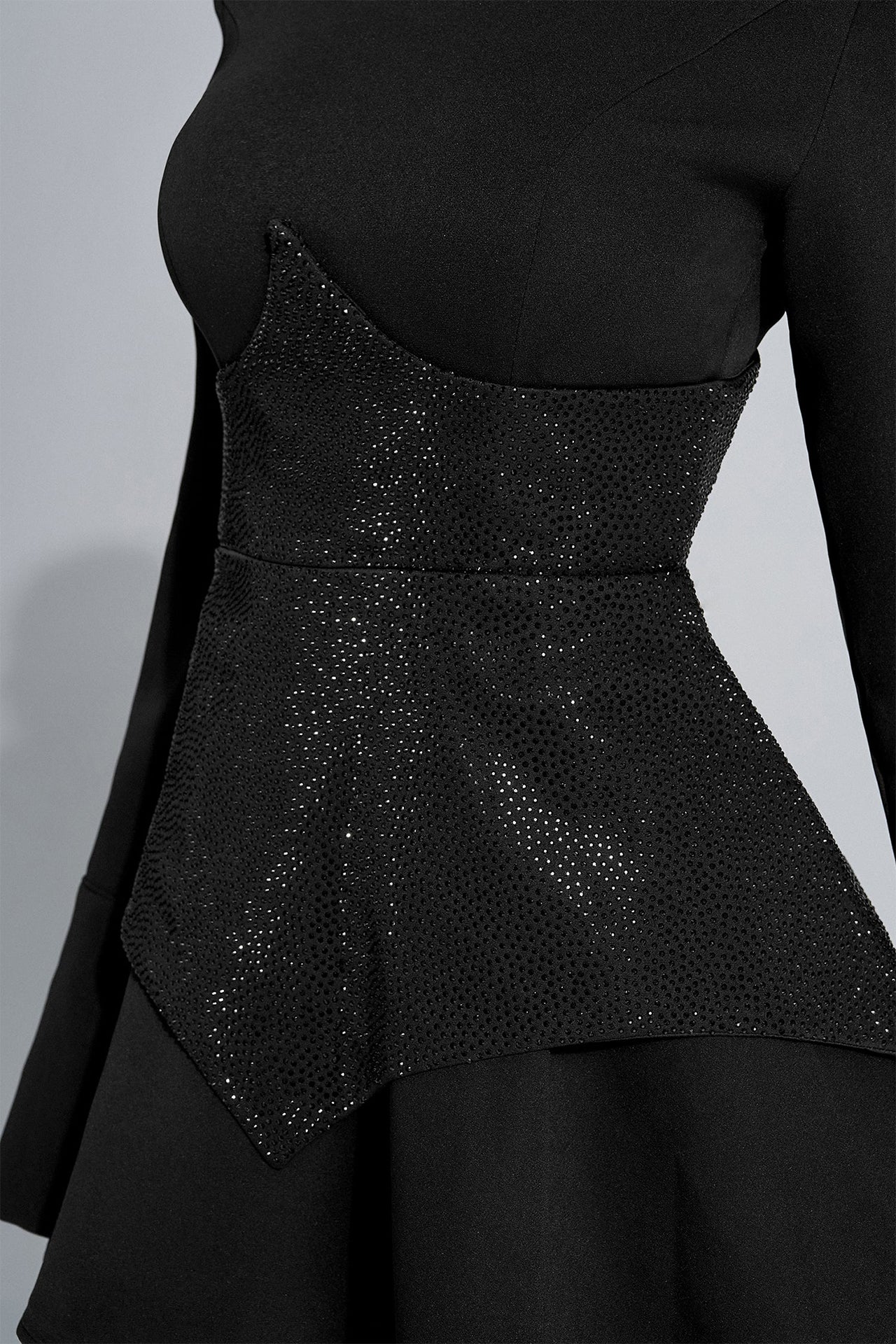 This short black dress with long sleeves and fine glitter. It's cut for a fitted fit and has a slim waist that's highlighted by shimmering fabric.