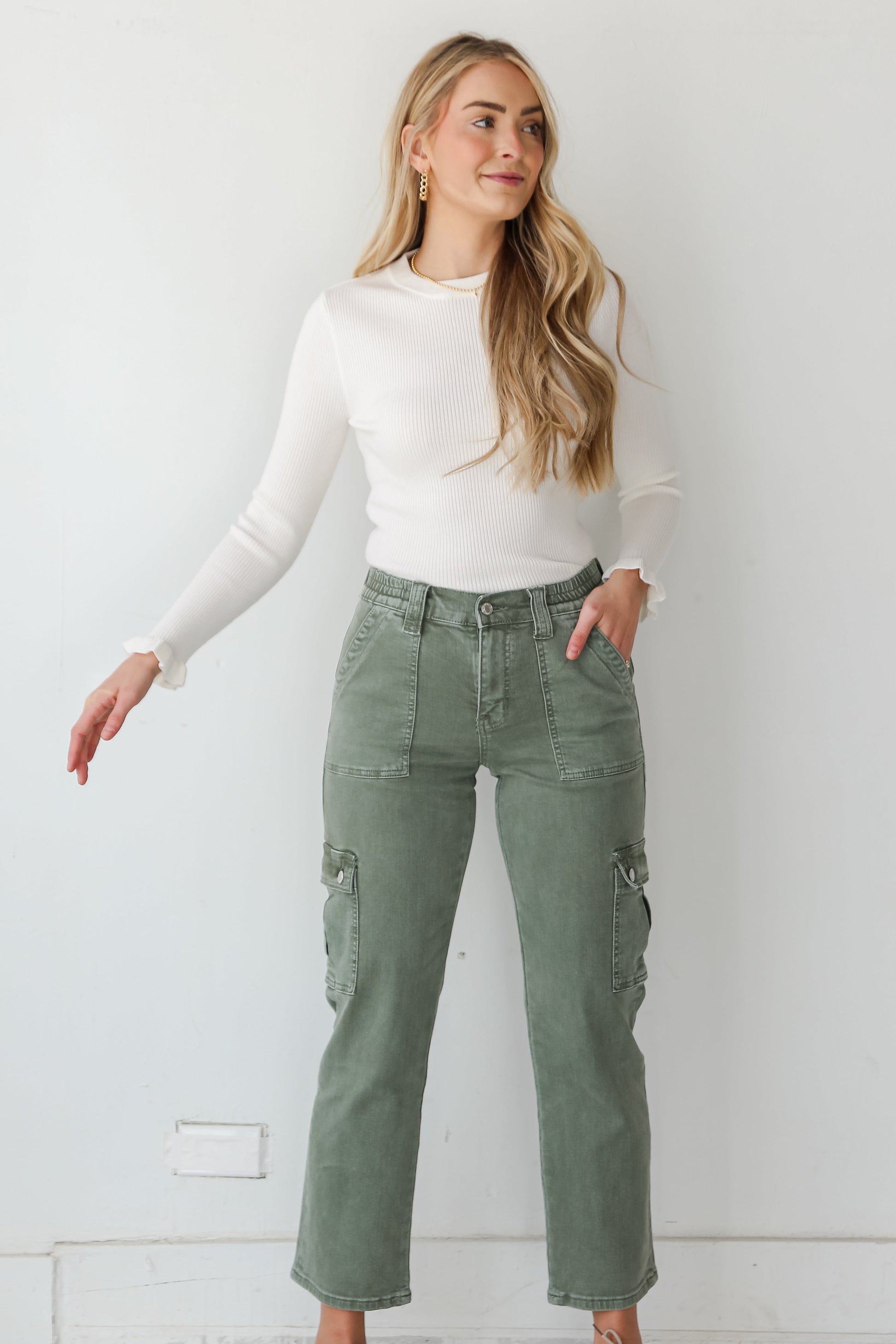 Introducing the Dixie Army Green Utility Cargo Jeans �a fusion of rugged style and contemporary fashion. designed for the modern woman who seeks a versatile and edgy addition to her wardrobe! These cargo jeans seamlessly blend utility-inspired details with a flattering fit for a bold yet practical look. Crafted from durable denim in a distinctive army green hue. these jeans exude an adventurous and confident vibe. The utility cargo pockets on the sides not only add a touch of military-inspired flair but also provide functional storage for your essentials. offering a perfect blend of style and utility. Whether paired with a simple tee for an effortlessly cool look or dressed up with a chic blouse. these cargo jeans are perfect for expressing your bold and adventurous style!