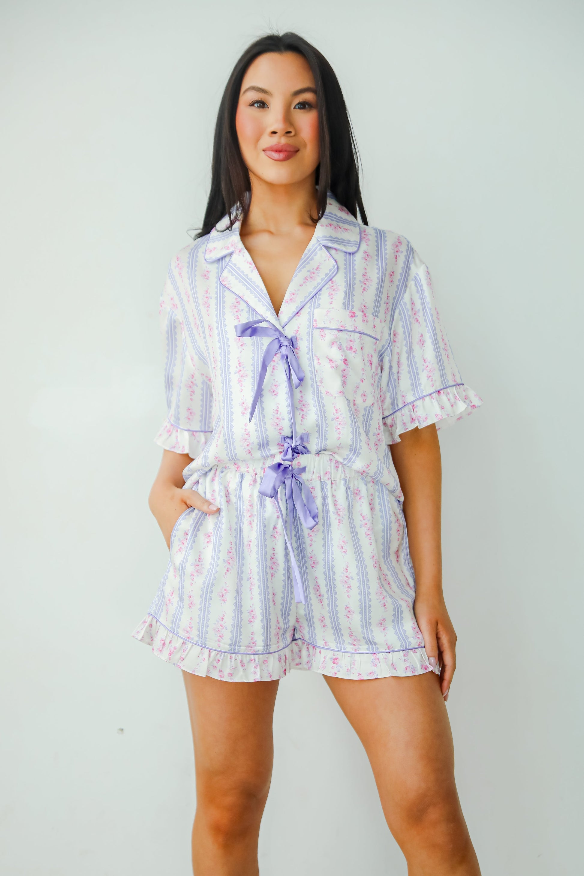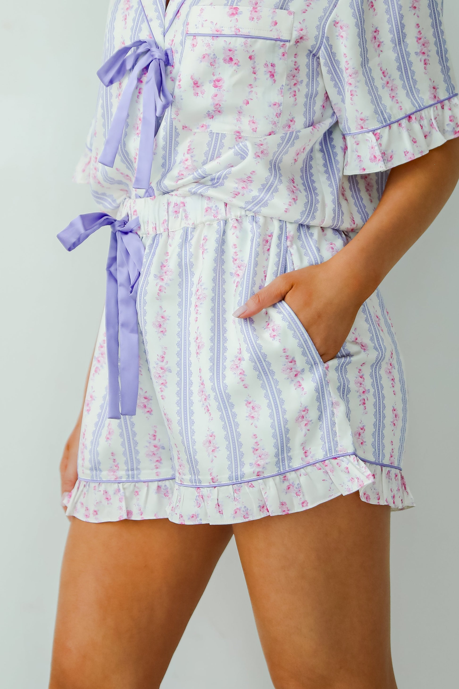 We can't wait to settle in for the night with a sweet look like the Dreaming Of You Purple Floral Pajama Shorts! Made from soft. silky satin. these shorts provide a smooth and breathable feel for a restful night's sleep or a relaxing day of lounging. The rich purple hue paired with a delicate floral print adds a touch of elegance and femininity. Featuring an elastic waistband for a comfortable. adjustable fit. these shorts offer a relaxed silhouette that moves with you. Pair them with the matching top or a cozy tank for a chic. coordinated look that's perfect for your next cozy night in!