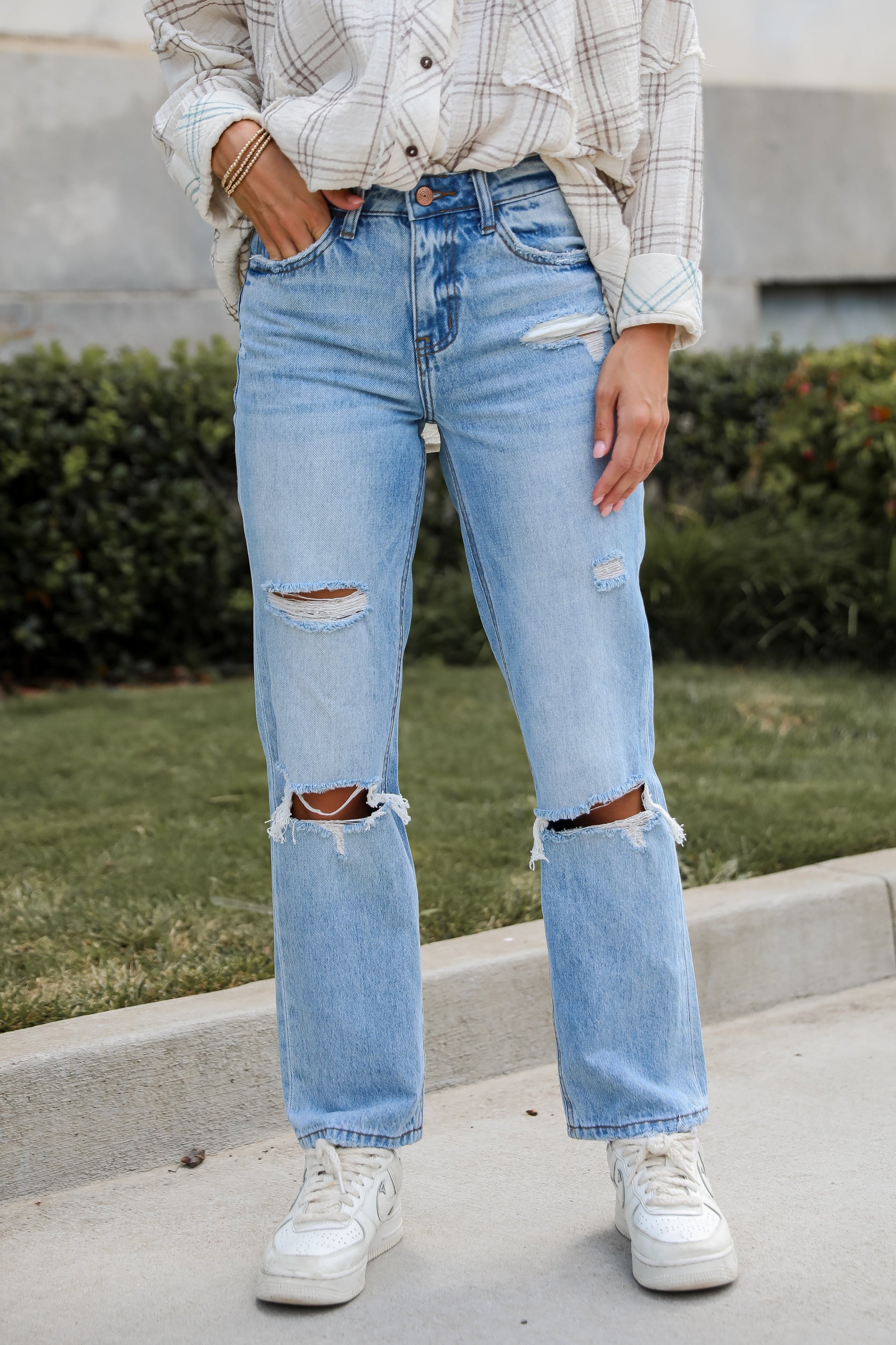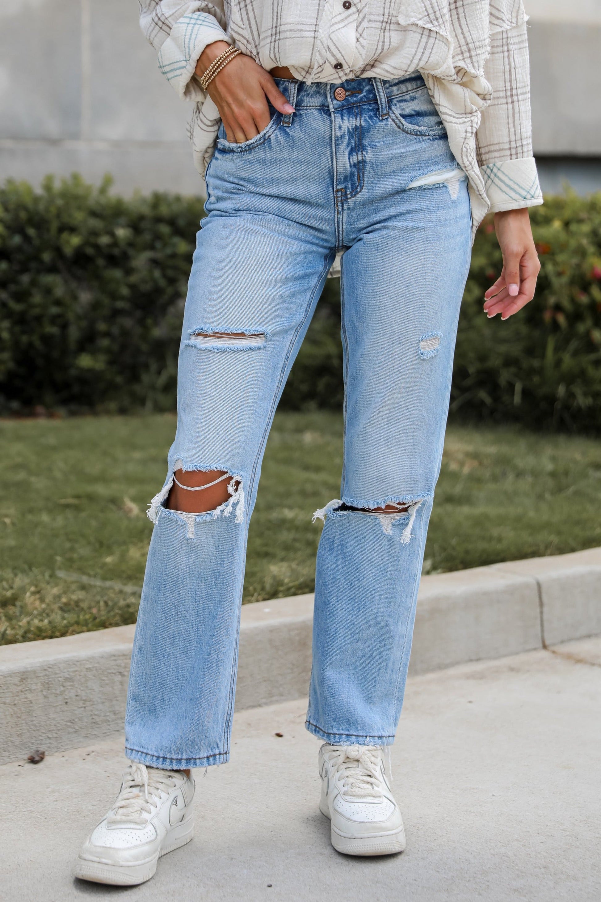 Discover the perfect blend of classic style and modern comfort with the Eliza Medium Wash High-Rise Straight Leg Distressed Jeans! Made from premium. durable denim with just the right amount of stretch. these jeans provide a flattering fit that moves with you throughout the day. The medium wash offers a versatile look that pairs effortlessly with a variety of tops and accessories. while the high-rise waist enhances your silhouette by accentuating your natural waistline. The straight-leg cut offers a timeless and streamlined look that elongates your legs. making these jeans suitable for any occasion. Embrace their timeless appeal and enjoy the effortless style and comfort they bring to your everyday outfits!
