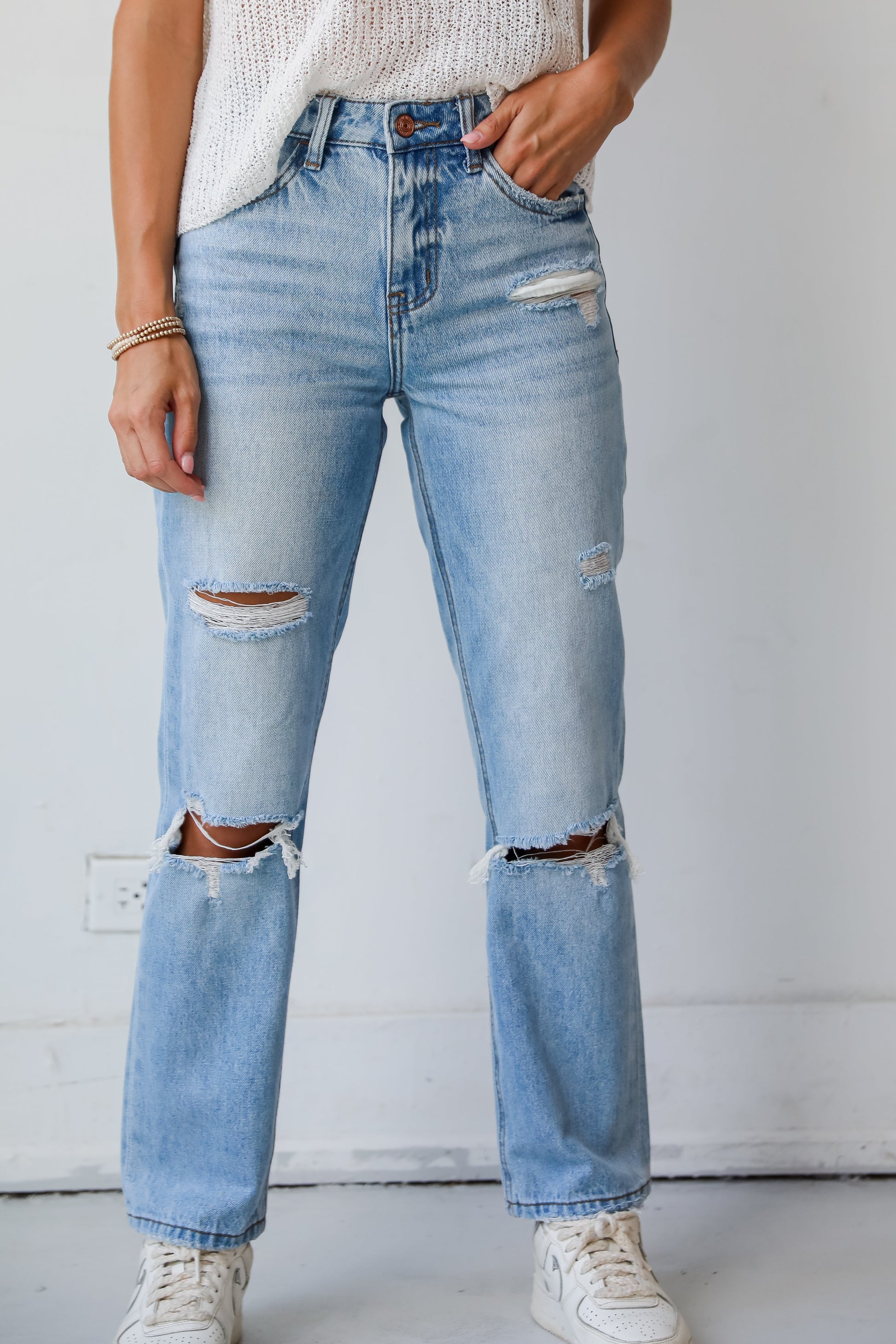 Eliza Medium Wash High-Rise Straight Leg Distressed Jeans