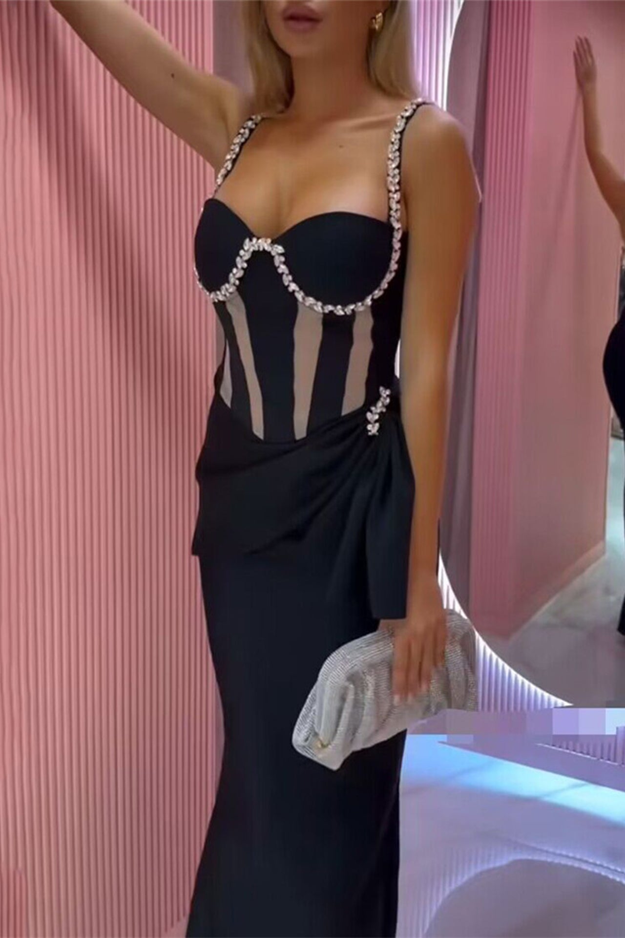 Evie Strap Mesh Pleated Maxi Dress is a glamorous and elegant ensemble. blending the shimmer of crystals with delicately pleated fabric. This dress exudes sophistication and style. making it the perfect choice for upscale events and special occasions where you want to radiate opulence and charm.
