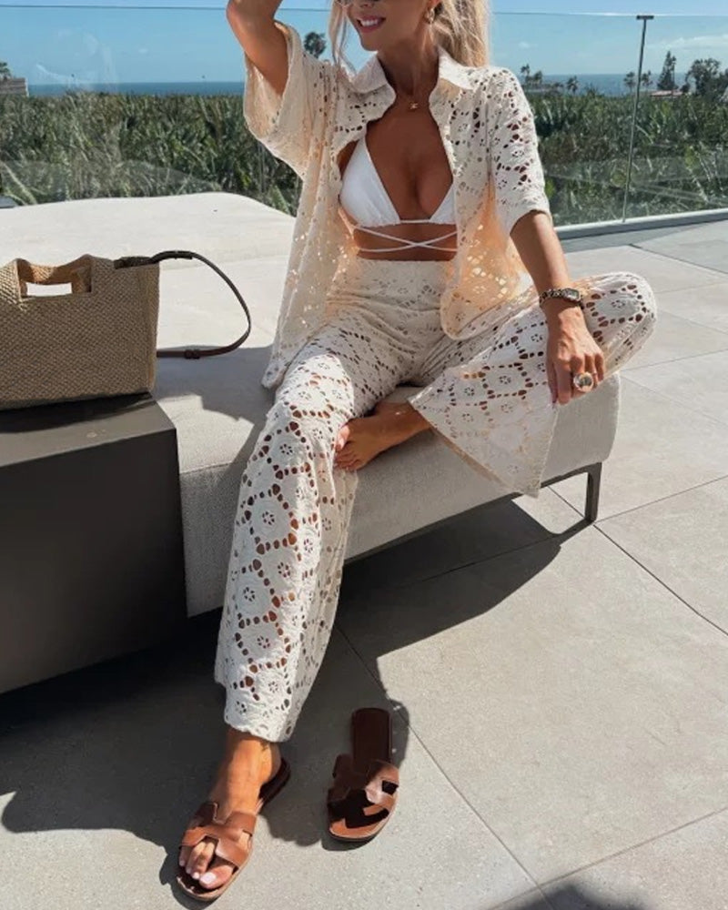 Fashion Hollow Lace Short Sleeve Trousers Set
