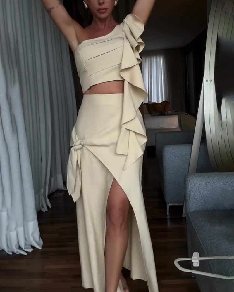 Fashion Ruffled One-Shoulder Top & Skirt Two-Piece Set