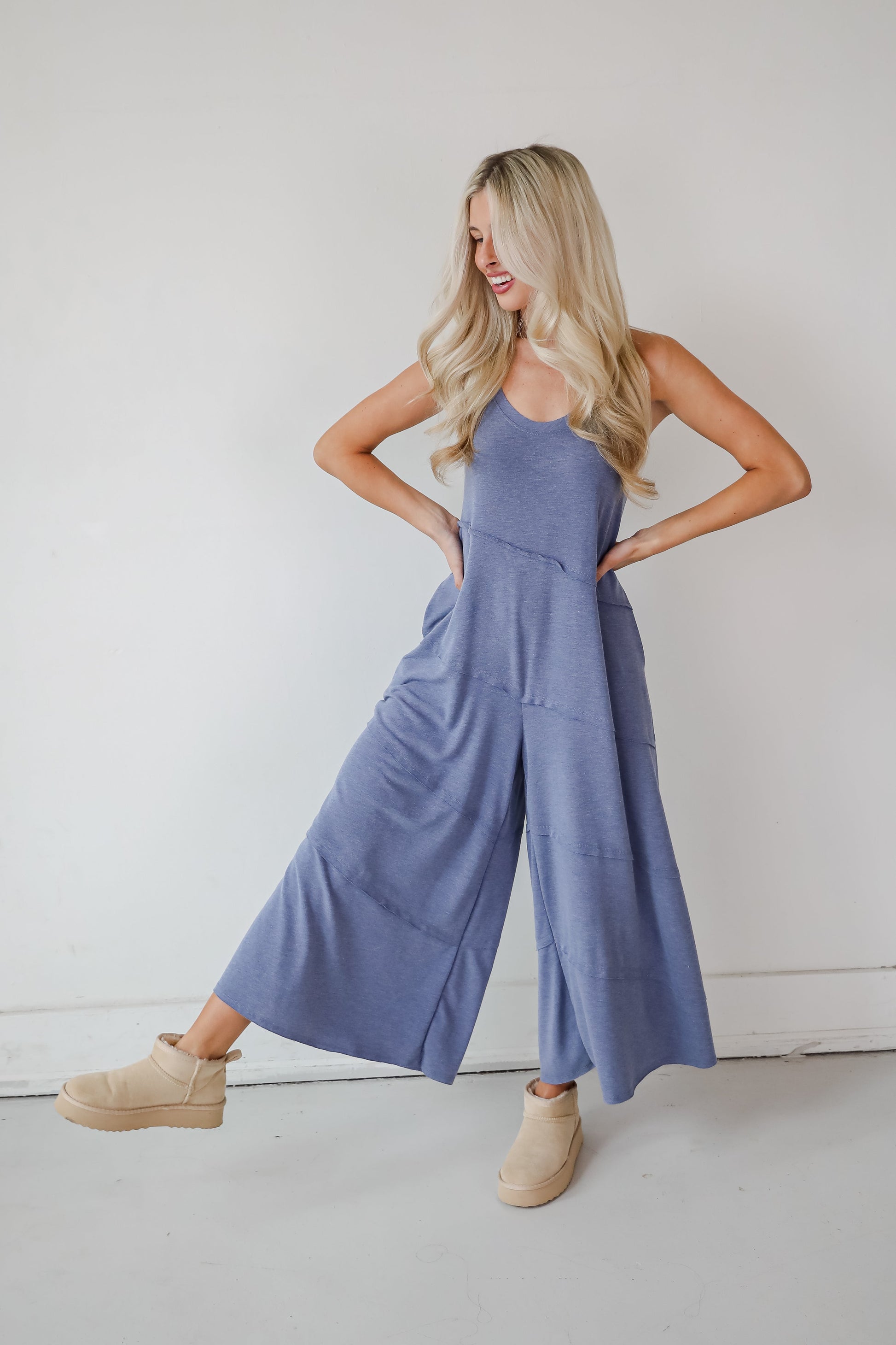 Let everyone get to know your sweet side in the Favorite Impression Denim Wide Leg Jumpsuit! Crafted from a soft. stretchy knit fabric with a relaxed wide-leg silhouette. this jumpsuit offers the perfect blend of comfort and chic. The sleeveless design and scoop neckline keep it breezy. while the subtle denim blue hue gives it a trendy. lived-in feel. Complete with side pockets for added convenience. this one-piece wonder is perfect for pairing with sneakers for a casual vibe or layering with a jacket for a polished touch. Easy. effortless. and endlessly versatile!