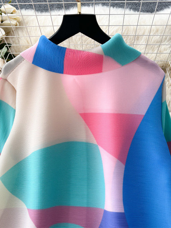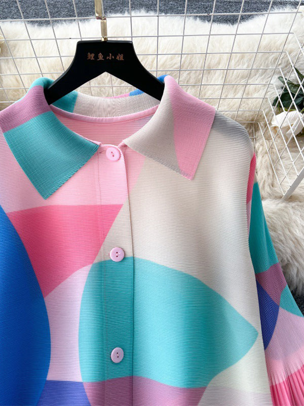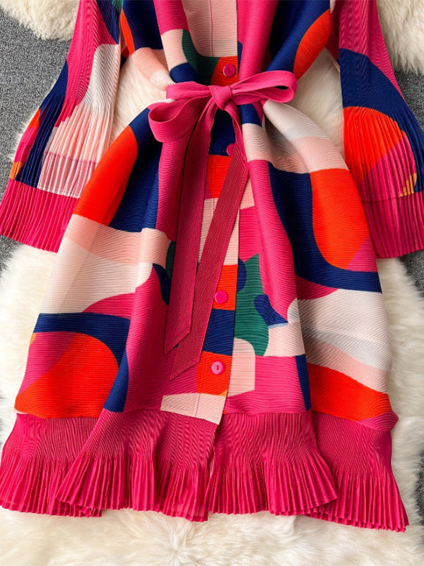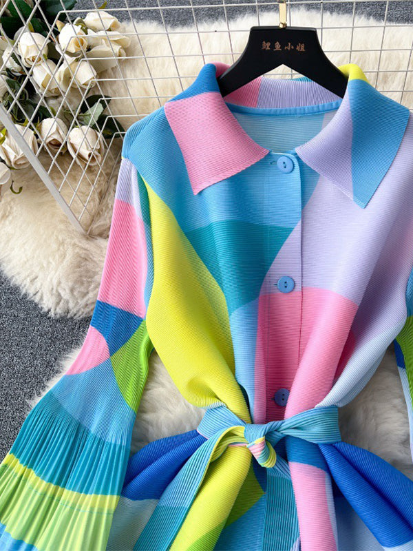Flared Sleeves Loose Belted Contrast Color Pleated Midi Dresses