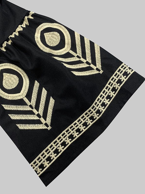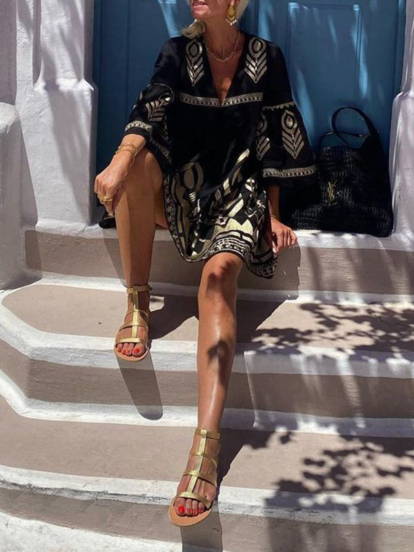 Flared Sleeves Loose Embroidered Split-Joint Deep V-Neck Mini Dresses