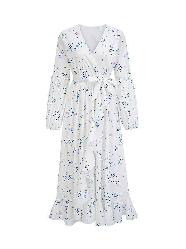 High Waisted High-Low Pleated Polka-Dot Tied Waist V-Neck Maxi Dresses