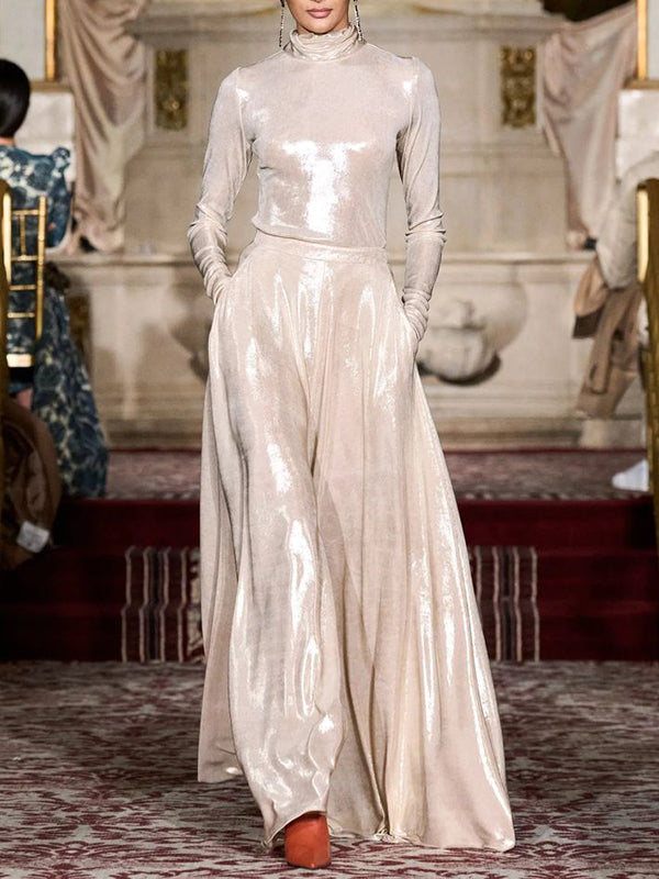 High Waisted Loose Pockets Shiny Solid Color Pants Trousers