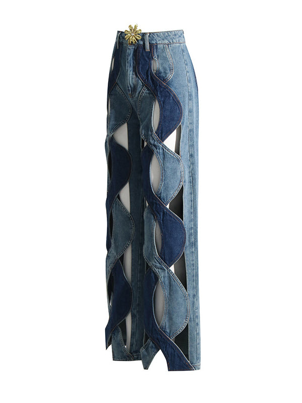 High Waisted Straight Leg Flower Shape Hollow Jean Pants Bottoms