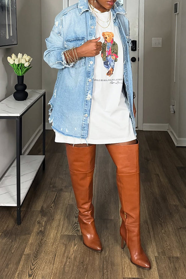 Stay on trend this season in our new casual. shirt collar jacket. We especially love the bleached fabric and think this piece will be a new favorite in your closet!