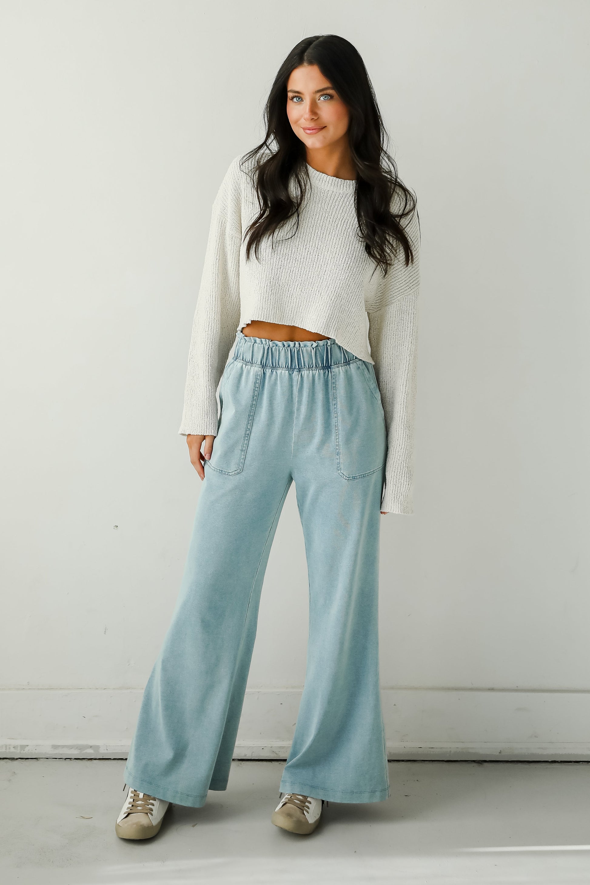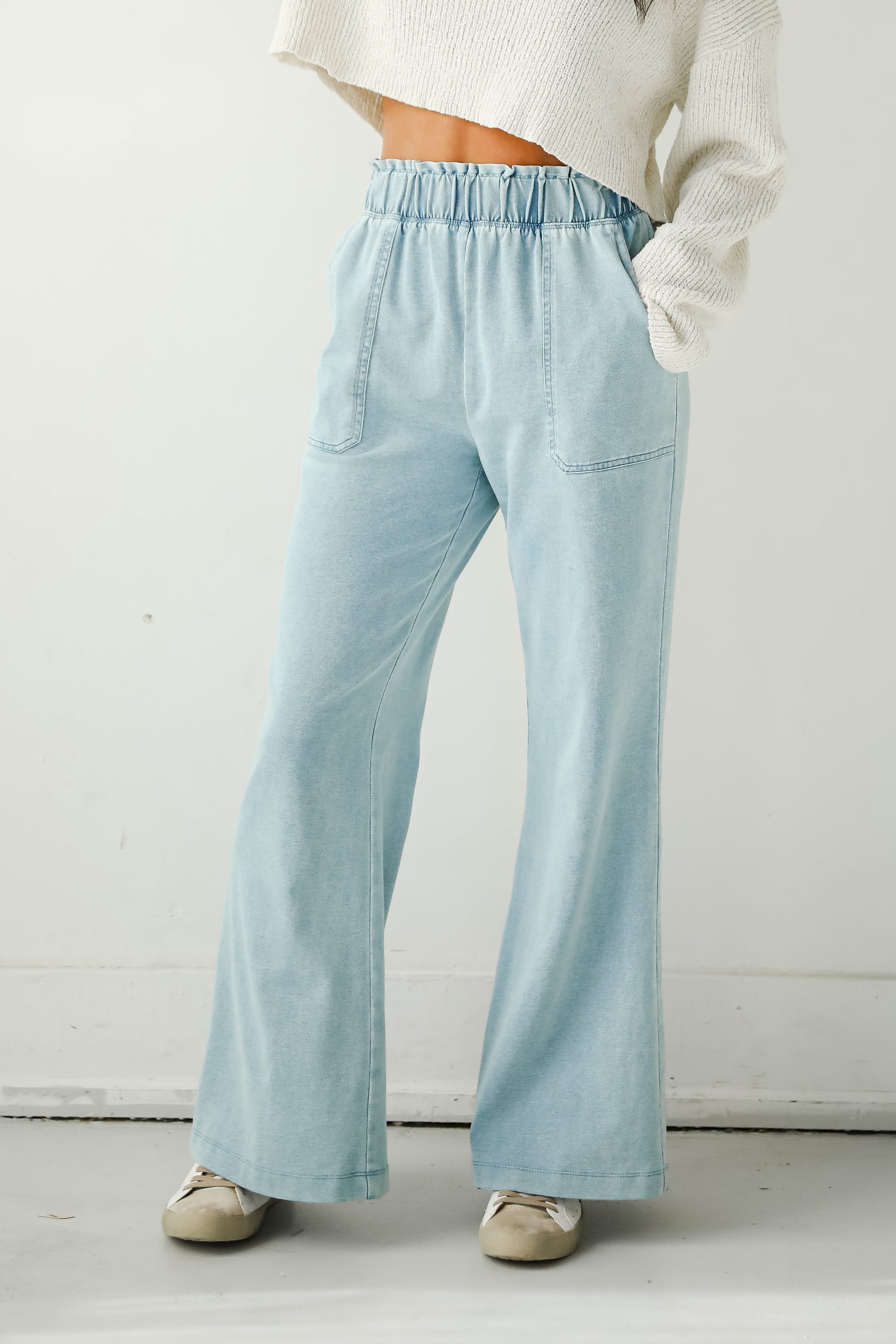 Stunning the crowd is as easy as stepping out in the Impressive Aesthetic Denim Wide Leg Pants! Combining the look of denim with the softness of knit fabric. these sweatpants feature a relaxed wide-leg silhouette that's perfect for lounging or casual outings. The paperbag waist adds a trendy touch with an elastic waistband for the perfect fit. Side pockets enhance functionality. while the versatile design makes them easy to dress up or down. Pair them with a fitted tank for a laid-back vibe or a cropped sweater for an effortlessly chic outfit!