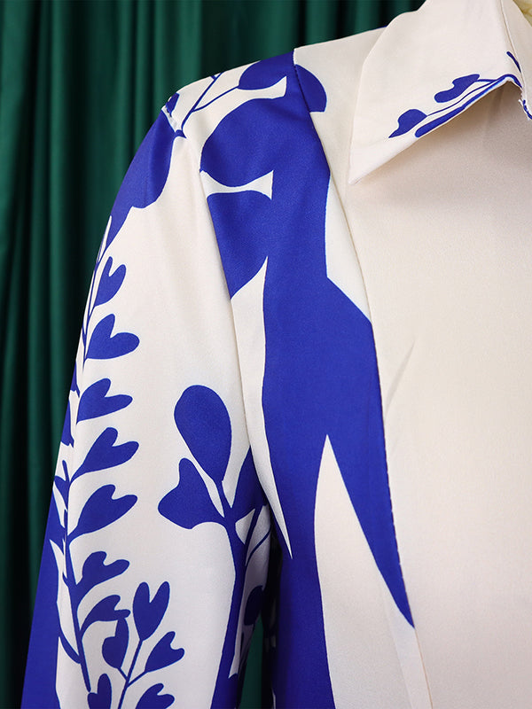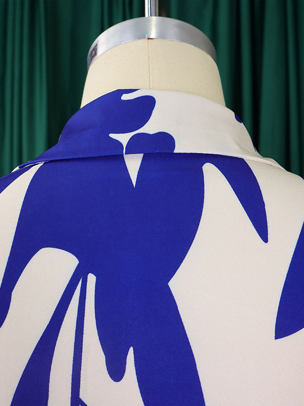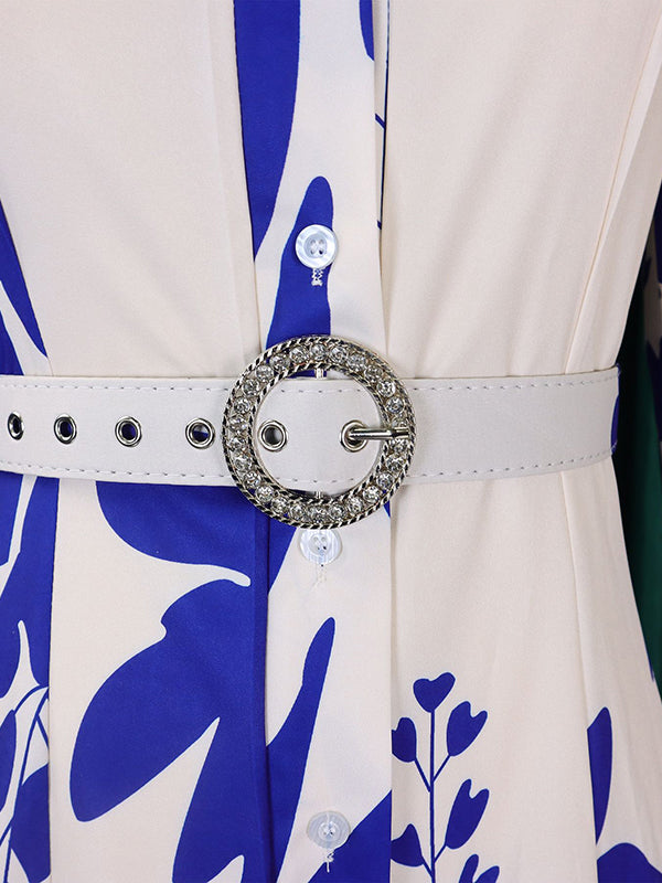 Irregular clipping Long Sleeves Lace-Up Pleated Printed Split-Joint Tied Waist Lapel Maxi Dresses Shirt Dress