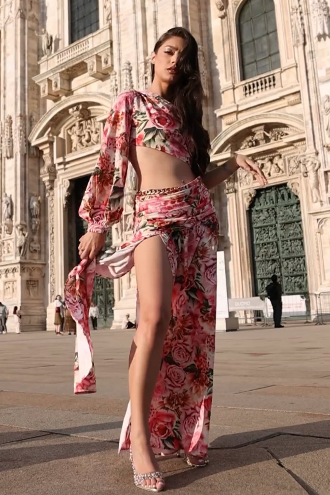 Need a vacation to unwind? That indispensable is the holiday-style Jessica One Shoulder Maxi Dress. Floral Printed fabric features one shoulder. a metal chain and hollow at the waist. and a high hem slit to complete this dress. Complete the casual-chic resort look with heels or sandals.
