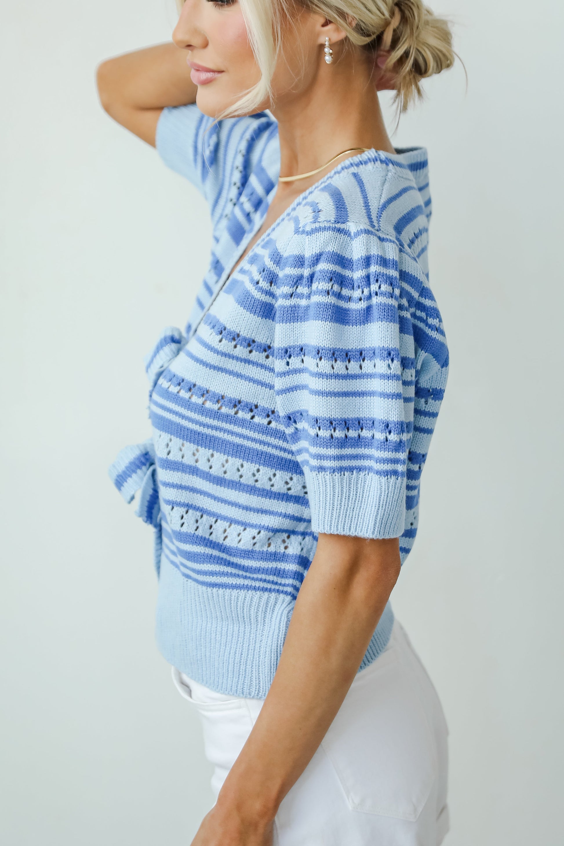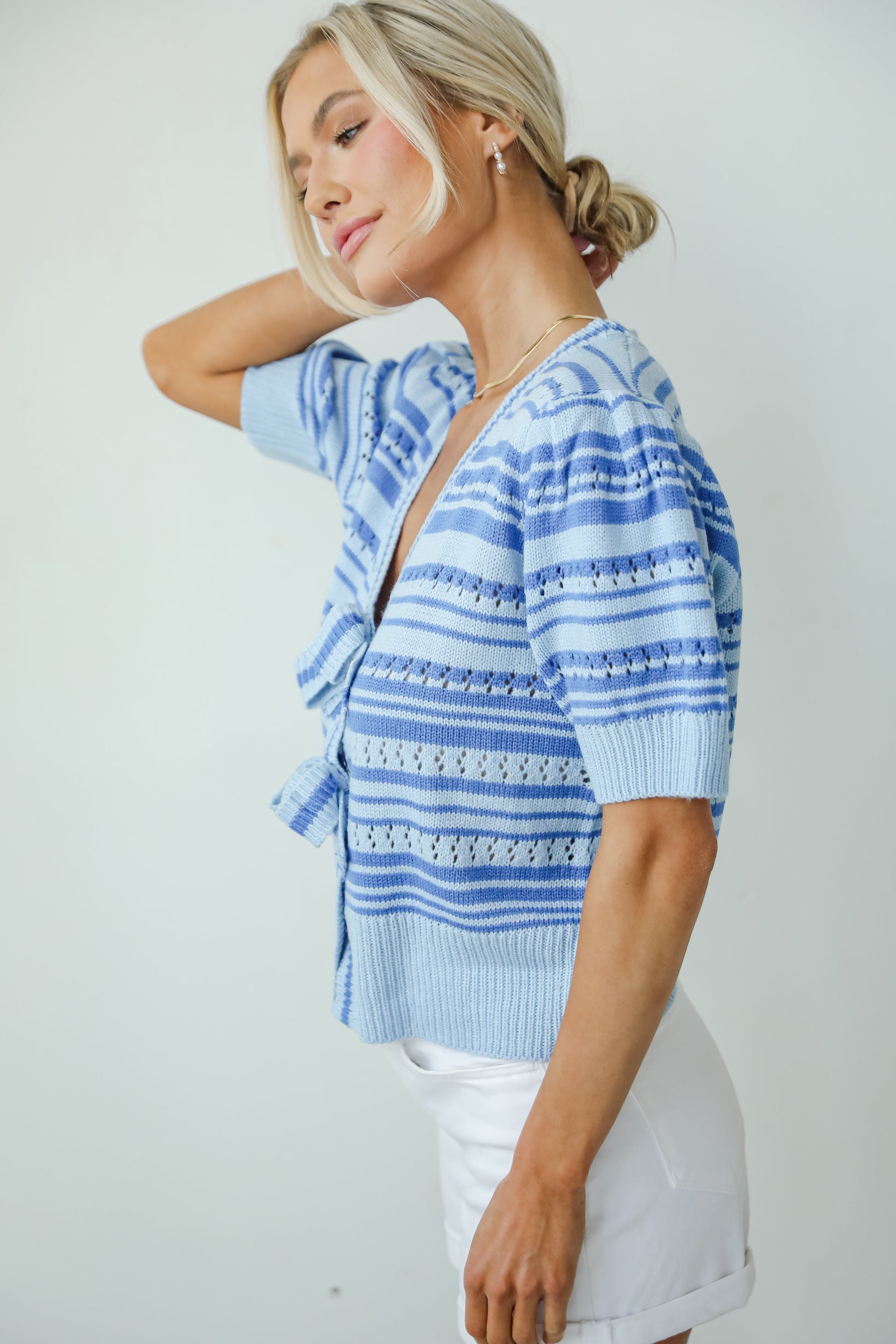 With the Lavish Coziness Light Blue Striped Bow Sweater Top. you can be the cuddly cutie of your dreams! Crafted from soft. lightweight knit. it features delicate light blue stripes for a fresh. breezy look. The snap front closure adds a modern. functional detail. while the dainty bow accents bring a playful. feminine touch. With its short sleeves and flattering fit. this sweater top is perfect for pairing with high-waisted jeans. skirts. or shorts. Whether you're dressing it up or keeping it casual. this versatile piece adds effortless style to any outfit!