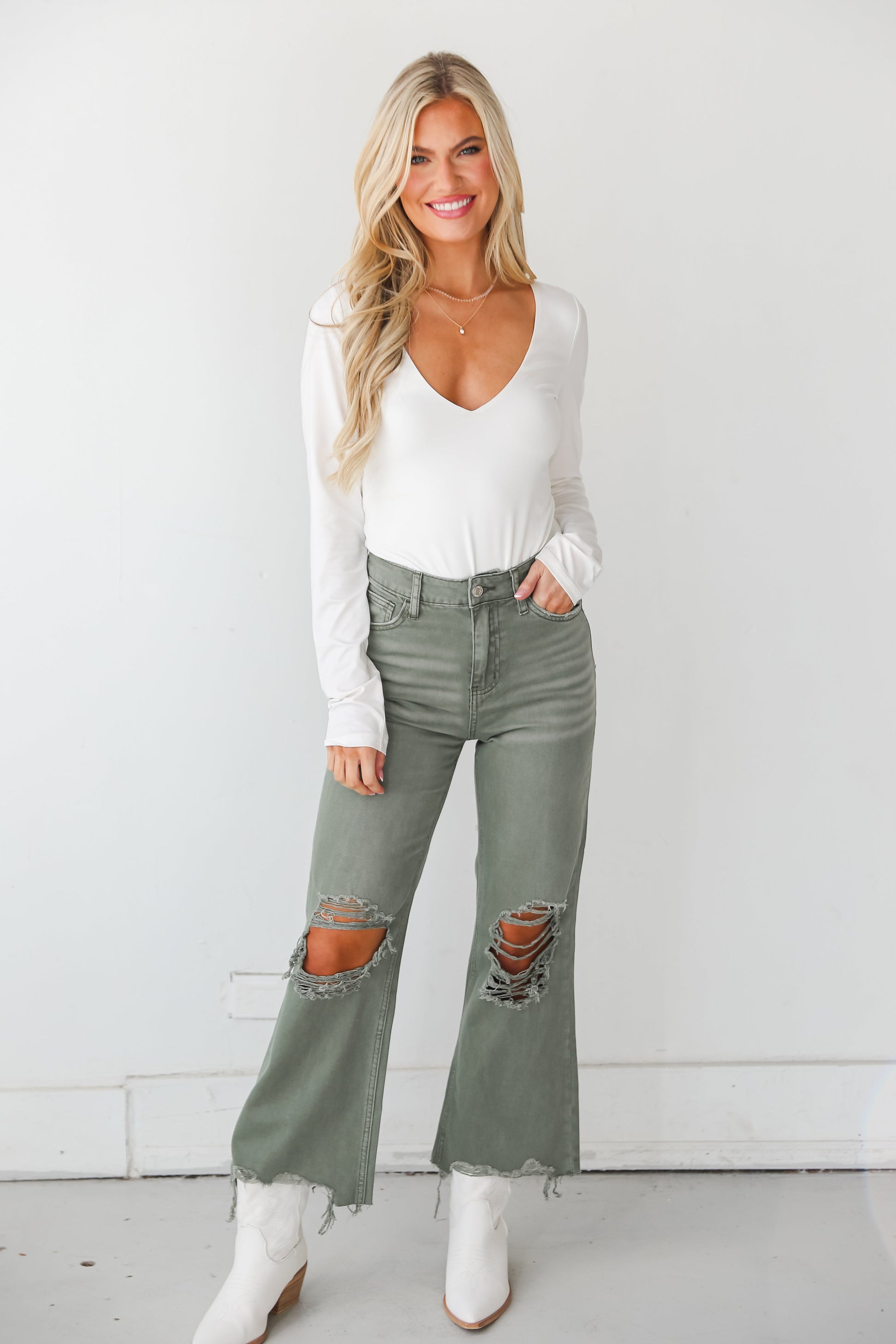 Introducing the Leslie Army Green 90s Vintage Crop Flare Jeans – a fusion of edgy style and military-inspired chic! These jeans redefine casual cool with their army green hue. distressed details. and trendy flare silhouette. creating a look that effortlessly combines ruggedness with a touch of glamour. Crafted from high-quality denim. the army green color adds a unique and contemporary twist to the classic distressed style. The distressed details provide a worn-in. lived-in feel. offering a perfect balance between casual and fashion-forward aesthetics. Whether you're pairing them with ankle boots for a bohemian vibe or heels for a more polished ensemble. these jeans add versatility to your wardrobe!
