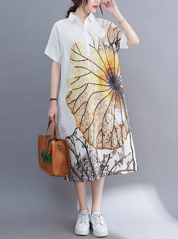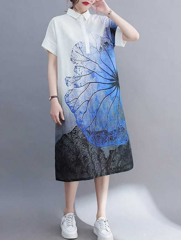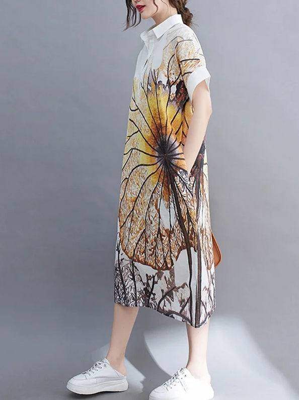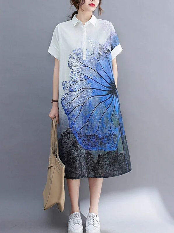 Literary Vintage Printing Button-Down Lapel Short-Sleeved Shirt Midi Dress