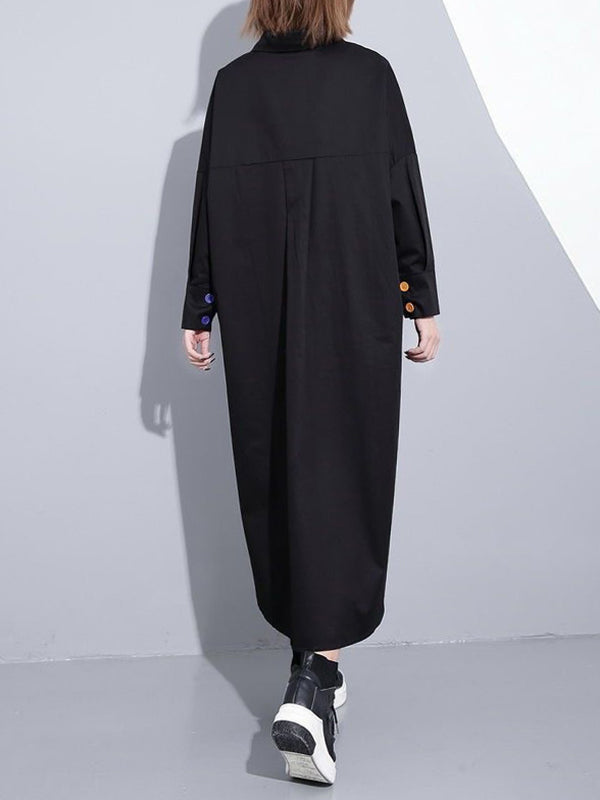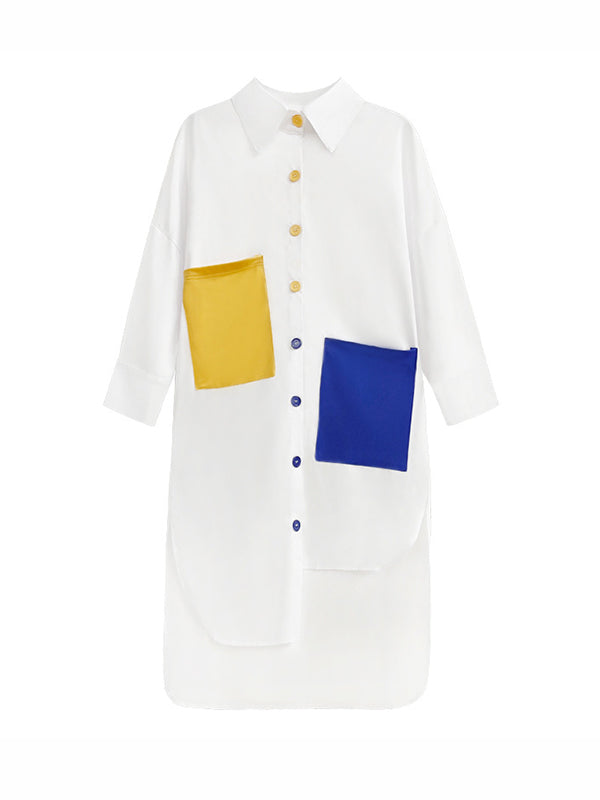 Long Sleeves Loose Asymmetric Buttoned Contrast Color Pockets Lapel Midi Dresses Shirt Dress