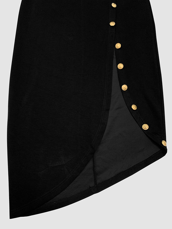 Long Sleeves Loose Asymmetric Buttoned Split-Joint Split-Side Mock Neck Maxi Dresses